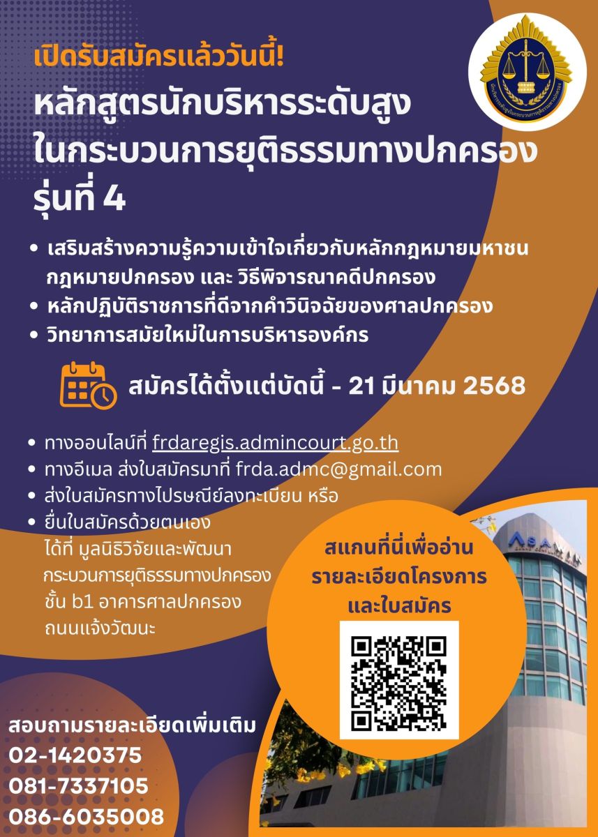 มูลนิธิวิจัยและพัฒนากระบวนการยุติธรรมทางปกครอง ร่วมกับสำนักงานศาลปกครอง เตรียมเปิดรับสมัครอบรมหลักสูตรนักบริหารระดับสูงในกระบวนการยุติธรรมทางปกครอง (บสป.) รุ่นที่ 4 ระหว่างวันที่ 5 กุมภาพันธ์ ถึงวันที่ 21 มีนาคม 2568