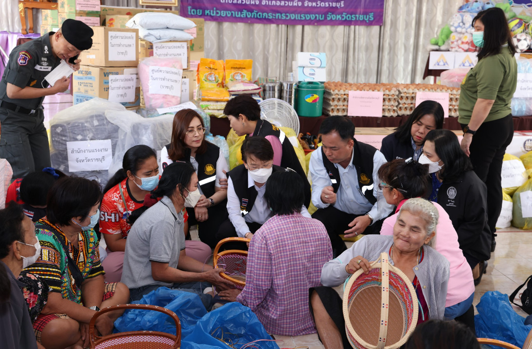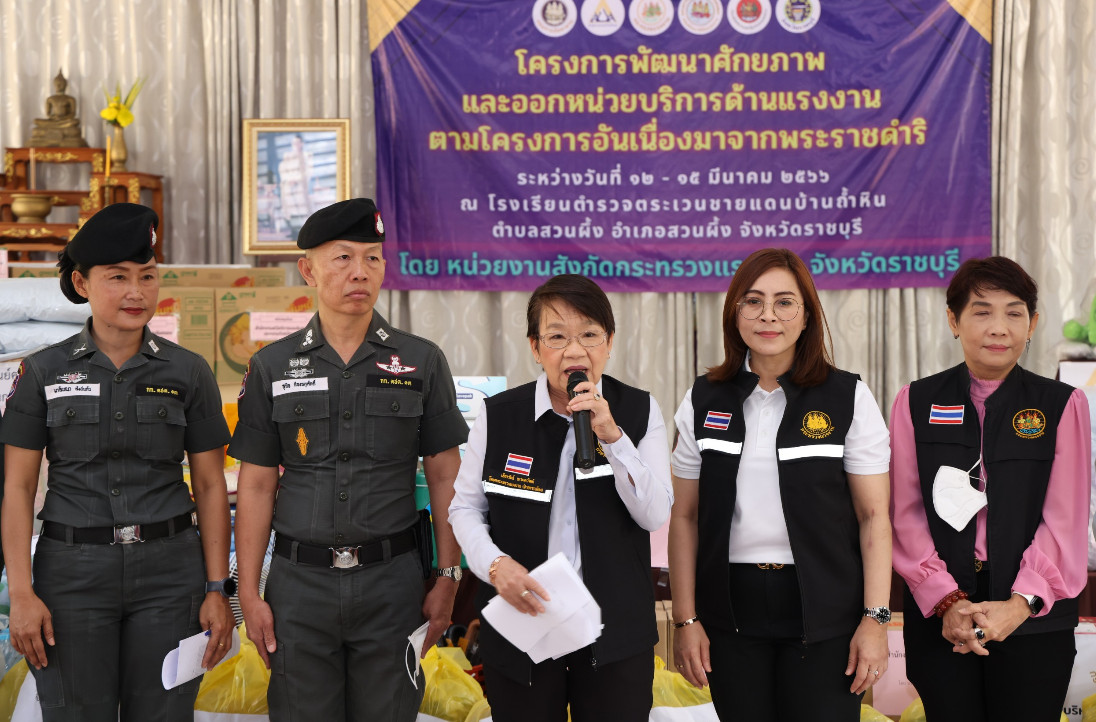 นางเธียรรัตน์ กล่าวว่า ท่านสุชาติ ชมกลิ่น รัฐมนตรีว่าการกระทรวงแรงงาน ได้ให้ความสำคัญกับการดำเนินงานโครงการอันเนื่องมาจากพระราชดําริฯ เพื่อให้ประชาชนทุกกลุ่มได้มีอาชีพ มีงานทำ และมีคุณภาพชีวิตที่ดี จึงได้ให้หน่วยงานในสังกัดกระทรวงแรงงานบูรณาการทำงานร่วมกันในการนำบริการด้านแรงงานมาให้บริการในจังหวัดที่มีโรงเรียนตำรวจตระเวนชายแดนในพื้นที่ จำนวน 40 จังหวัด ดำเนินการแล้ว 8 จังหวัด ในส่วนของจังหวัดราชบุรีในวันนี้ มีสถาบันพัฒนาฝีมือแรงงาน 4 ราชบุรี ดำเนินการฝึกหลักสูตรการทำผลิตภัณฑ์ปูนปั้นไม้เทียมเพื่อการประดับ ให้บริการซ่อมรถจักรยานยนต์ฟรี สำนักงานจัดหางานจังหวัดราชบุรี ดำเนินการฝึกหลักสูตรการฝึกสานตะกร้าจากหวายเทียม และมอบวัสดุอุปกรณ์หลังฝึก ได้แก่ โครงตะกร้า หวายเทียม กรรไกร เข็ม กาวน้ำ เพื่อให้ผู้ฝึกเป็นเครื่องมือทำกินได้นำไปประกอบเป็นอาชีพหลักหรืออาชีพเสริมภายหลังจบการฝึกกิจกรรมเพิ่มอาชีพ เพิ่มรายได้ จำนวน 20 คน ซึ่งหลักสูตรที่คัดเลือกนำมาฝึกอบรมนั้นเป็นความต้องการของคนในพื้นที่ เพราะเป็นหลักสูตรที่ใช้เวลาการฝึกไม่นาน ฝึกจบแล้วสามารถประกอบอาชีพได้ทันที อีกทั้งมีวัตถุดิบอยู่ในท้องถิ่น นอกจากการสอนทักษะฝีมือแล้ว ยังมีการสอนให้คิดต้นทุน การหาตลาดด้วย สำนักงานประกันสังคมจังหวัด ให้บริการตรวจสุขภาพเบื้องต้นจากโรงพยาบาลสวนผึ้ง และประชาสัมพันธ์พร้อมรับสมัครการประกันสังคมมาตรา 40 สำนักงานแรงงานจังหวัด โดยชมรมอาสาสมัครแรงงานจังหวัดราชบุรีแจกไอศกรีมและขนม หน่วยงานสังกัดกระทรวงแรงงานยังได้ร่วมกับชมรมอาสาสมัครแรงงานและภาคเอกชน มอบเครื่องอุปโภคบริโภคแก่โรงเรียนตำรวจตระเวนชายแดนด้วย