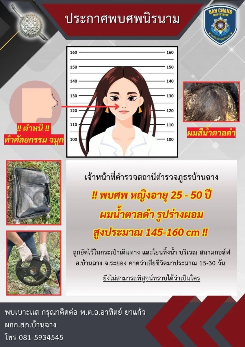 วันที่ 8 กุมภาพันธ์ 2568 ล่าสุด ทางเพจ สภ.บ้านฉาง ได้ฝากประชาสัมพันธ์ พร้อมระบุ ตำหนิรูปพรรณ ศพหญิงนิรนามถูกฆ่ายัดกระเป๋าถ่วงน้ำ ว่า พบศพเป็นหญิง คาดว่าอายุประมาณ 25-50 ปี / ผมสีน้ำตาลดำ รูปร่างผอม / สูงประมาณ 145-160 เซนติเมตร มีตำหนิ คือพบว่ามีการทำศัลยกรรมจมูก และคาดว่าเสียชีวิตมาแล้วประมาณ 15-30 วัน