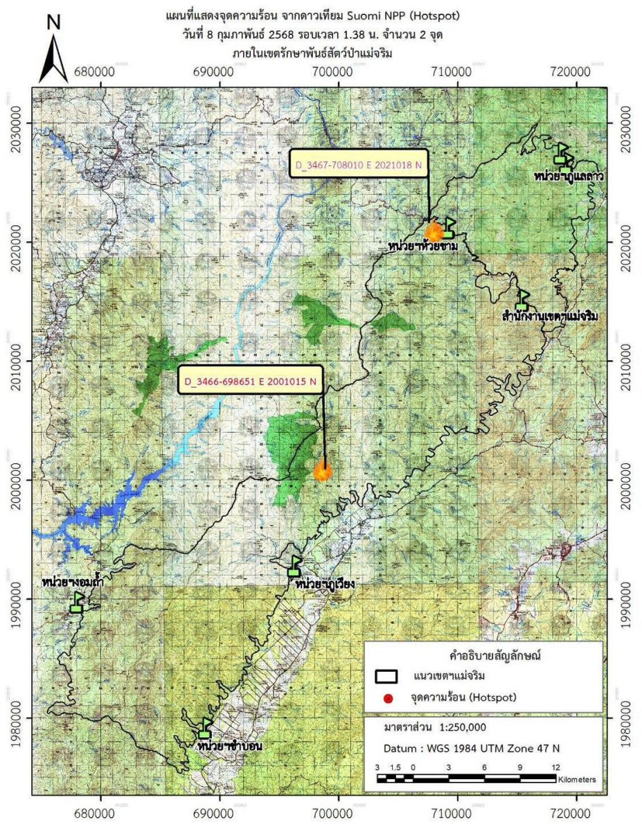 ว่าที่ร้อยตรีสิทธิศักดิ์ ฉันสิมา หัวหน้าเขตรักษาพันธุ์สัตว์ป่าแม่จริม รายงานว่า วันที่ 8 กุมภาพันธ์ 2568 เวลา 01.38 น. ดาวเทียม Suomi NPP ตรวจพบ HOTSPOT ในพื้นที่ ขสป.แม่จริม จำนวน 2 จุด ดังนี้
