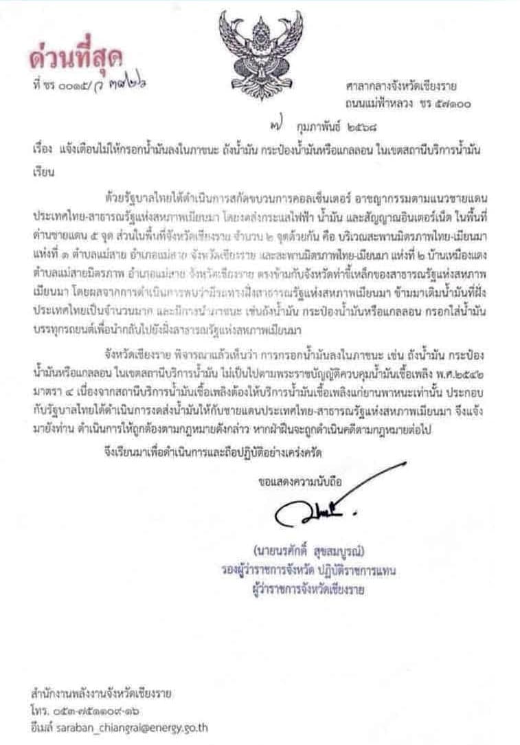 นายนรศักดิ์ สุขสมบูรณ์ รองผู้ว่าราชการจังหวัด ปฏิบัติราชการแทน ผู้ว่าราชการจังหวัดเชียงราย ได้ลงนามในหนังสือด่วนที่สุด ที่ ชร 0015/ ว 3826 ศาลากลางจังหวัดเชียงราย ลงวันที่ 7 ก.พ. 2568 เรื่อง แจ้งเตือนไม่ให้มีการกรอกน้ำมันลงในภาชนะ ถังน้ำมัน กระป๋องหรือแกลลอน ในเขตสถานีบริการน้ำมัน