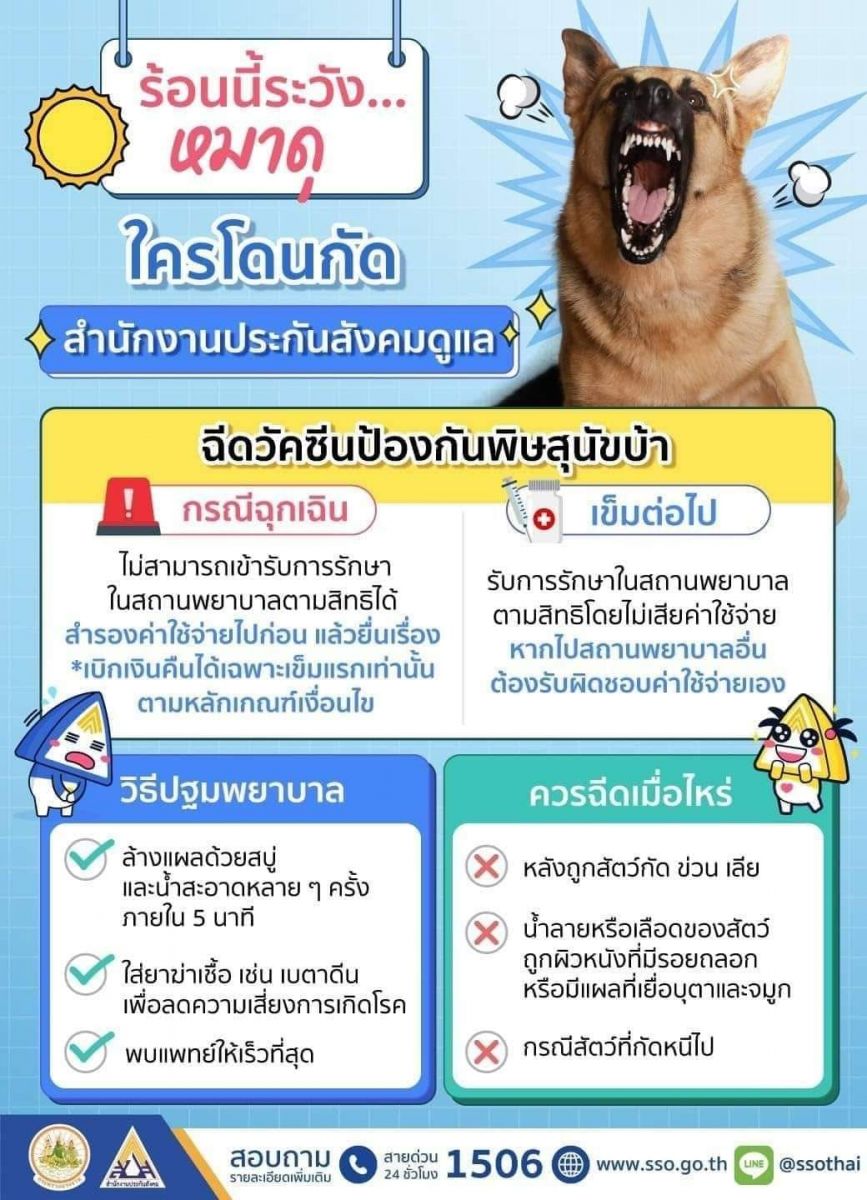 สำนักงานประกันสังคม แจ้งสิทธิประโยชน์ผู้ประกันตน กรณีถูกสุนัขหรือสัตว์เลี้ยงกัด สามารถเข้ารับการฉีดวัคซีนป้องกันโรคพิษสุนัขบ้าได้ โดยไม่เสียค่าใช้จ่าย ดังนี้