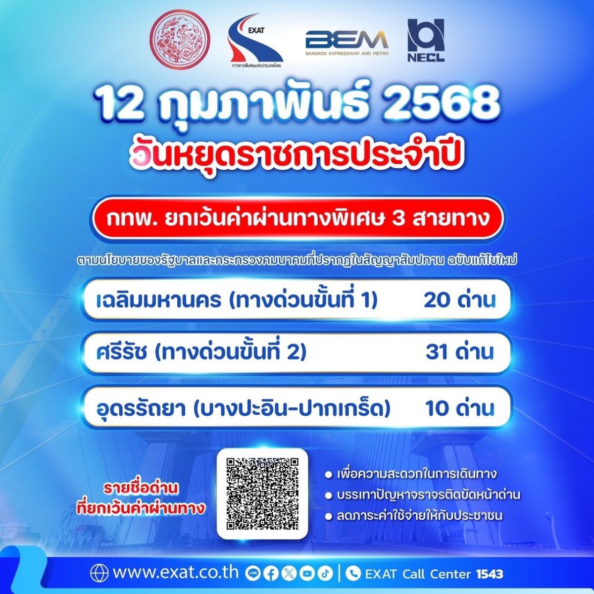 การทางพิเศษแห่งประเทศไทย (กทพ.) กระทรวงคมนาคม ยกเว้นค่าผ่านทางพิเศษของทางพิเศษ ในวันพุธที่ 12 กุมภาพันธ์ 2568 (วันมาฆบูชา) ตั้งแต่เวลา 00.01 น. ถึง 24.00 น. ซึ่งเป็นวันหยุดราชการประจำปีตามประกาศสำนักนายกรัฐมนตรี รวม 3 สายทาง ดังนี้