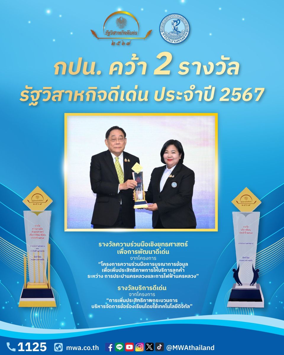 เมื่อวันที่ 10 กุมภาพันธ์ 2568 เวลา 09.30 น. ณ ตึกสันติไมตรี ทำเนียบรัฐบาล นางสาวสุวรา ทวิชศรี ผู้ว่าการการประปานครหลวง (กปน.) พร้อมด้วยนางสาวฉวีวรรณ อุทัยพิบูลย์ รองผู้ว่าการ กปน. รับรางวัลรัฐวิสาหกิจดีเด่น (SOE Awards) ประจำปี 2567 ได้แก่ รางวัลความร่วมมือเชิงยุทธศาสตร์เพื่อการพัฒนาดีเด่น และรางวัลบริการดีเด่น ซึ่งจัดโดย สำนักงานคณะกรรมการนโยบายรัฐวิสาหกิจ (สคร.) กระทรวงการคลัง ภายใต้แนวคิด “รัฐวิสาหกิจไทย มากกว่าความภูมิใจ สู่การพัฒนาที่ยั่งยืน : Beyond Pride, Towards Sustainability” โดยมี นายพิชัย ชุณหวชิร รองนายกรัฐมนตรีและรัฐมนตรีว่าการกระทรวงการคลัง เป็นประธานมอบรางวัล ในการนี้ คณะผู้บริหาร กปน. ร่วมแสดงความยินดี
