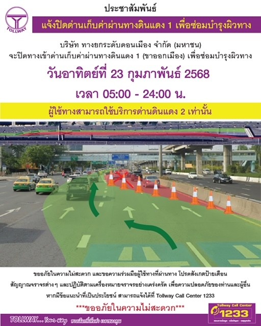 ปิดด่านดินแดง 1 เพื่อซ่อมบำรุงผิวทาง ผู้ใช้ทางสามารถใช้บริการด่านดินแดง 2 ได้ตามปกติ