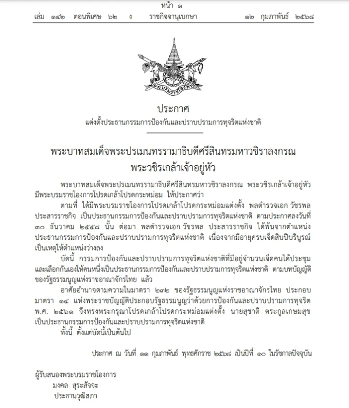 อาศัยอำนาจตามความในมาตรา 232 ของรัฐธธรรมนูญแห่งราชอาณาจักรไทย ประกอบมาตรา 14 แห่งพระราชบัญญัติประกอบรัฐธรรมนูญว่าด้วยการป้องกันและปราบปรามการทุจริตพ.ศ. 2561 จึงทรงพระกรุณาโปรดเกล้าโปรดกระหม่อมแต่งตั้ง นายสุชาติ ตระกูลเกษมสุข ป็นประธานกรรมการป้องกันและปราบปรามการทุจริตแห่งชาติ