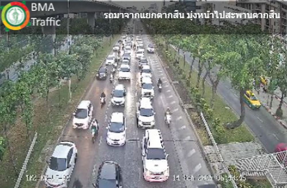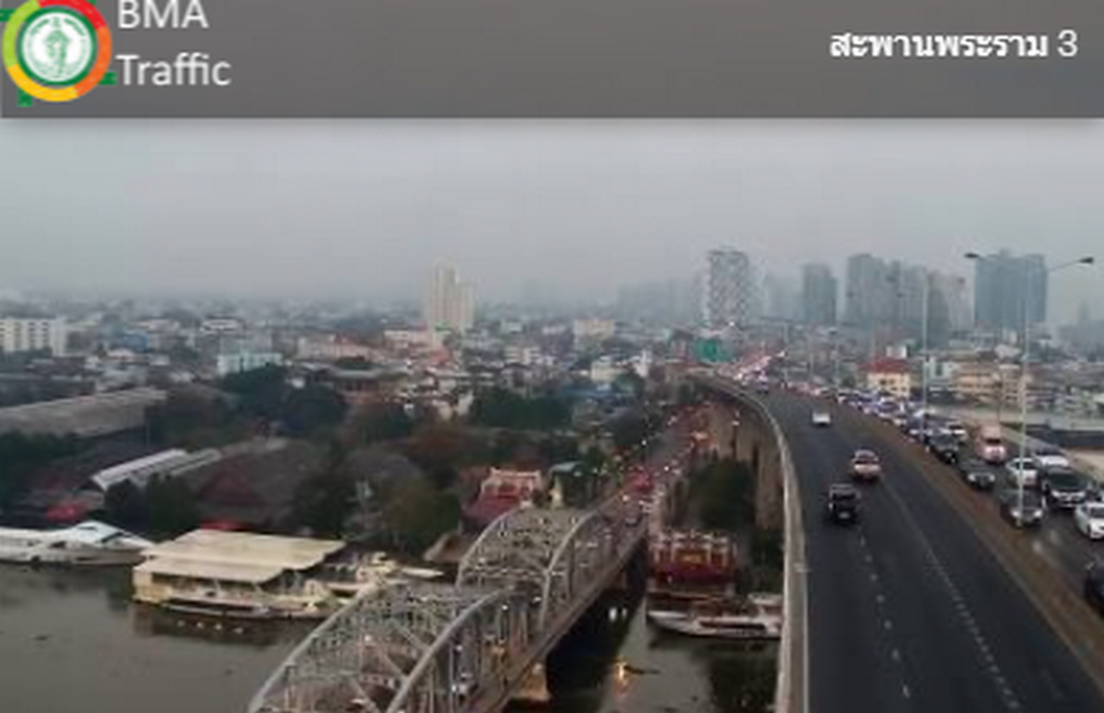 - สะพานกรุงธน (ซังฮี้) ขาเข้า ติดขัด ท้ายอยู่ที่เชิงทางขึ้นสะพานข้ามแยกบางพลัด