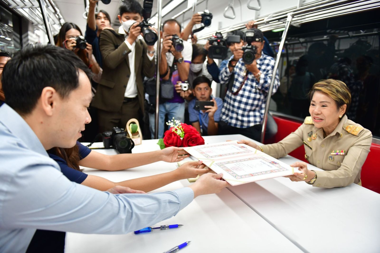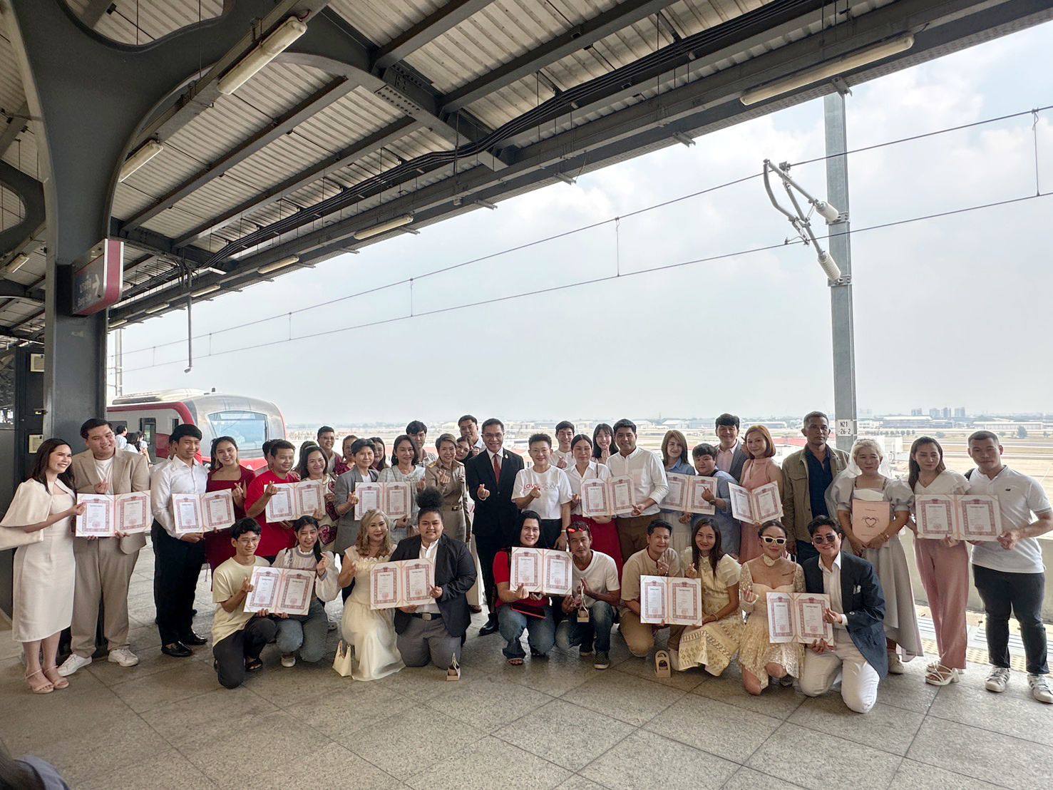 ในการนี้ นางสาวภัทร์กร สินสุข ผู้อำนวยการเขตจตุจักร ให้เกียรติเป็นนายทะเบียนในการจดทะเบียนสมรสลอยฟ้า โดยมีนายสุเทพ พันธุ์เพ็ง กรรมการผู้อำนวยการใหญ่ หรือผู้ให้บริการรถไฟฟ้าชานเมืองสายสีแดง ร่วมแสดงความยินดีกับทุกคู่รักด้วย
