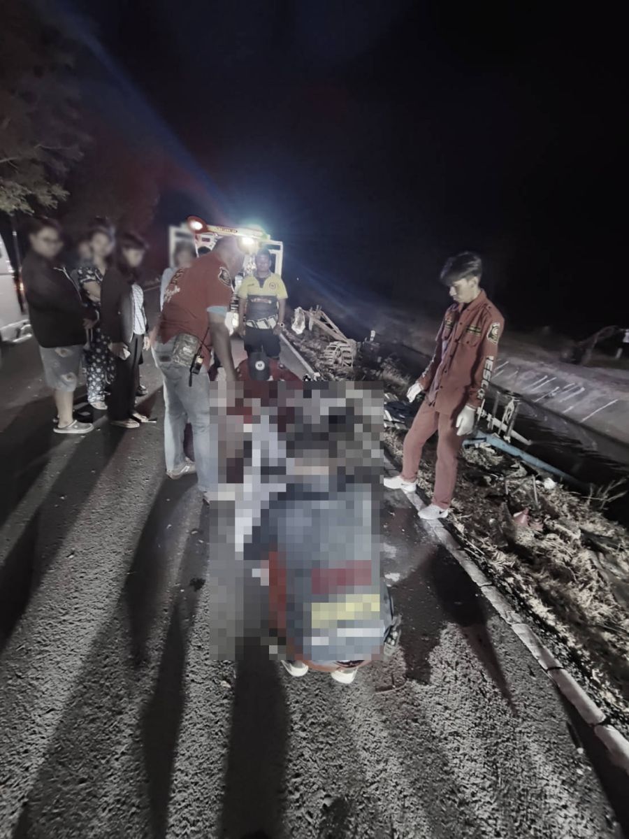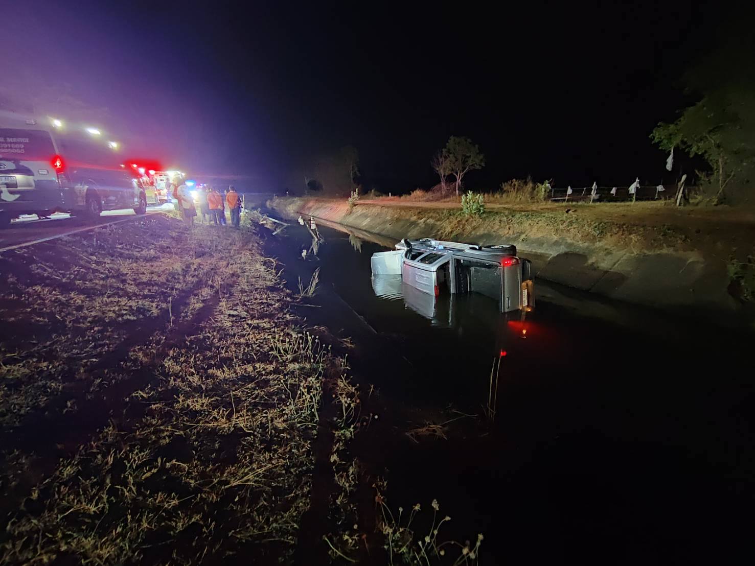 ที่เกิดเหตุ พบรถกระบะ อีซูซุ สีเทา ป้ายทะเบียน สุรินทร์ ลักษณะพลิกตะแคงอยู่ในคลองน้ำข้างทาง ตรวจสอบพบว่ามีผู้บาดเจ็บ 1 รายอาการสาหัสและหมดสติ ทางอาสาสมัครช่วยเหลือนำร่างขึ้นฝั่งแล้วดำเนินการปั๊มหัวใจ แต่ไม่เป็นผล เสียชีวิตในเวลาต่อมา ตรวจสอบเอกสาร เป็นชายไทย อายุ 55 ปี ในส่วนของสาเหตุอยู่ระหว่างการสอบสวนของเจ้าหน้าที่ตำรวจ สภ.เมืองสุรินทร์
