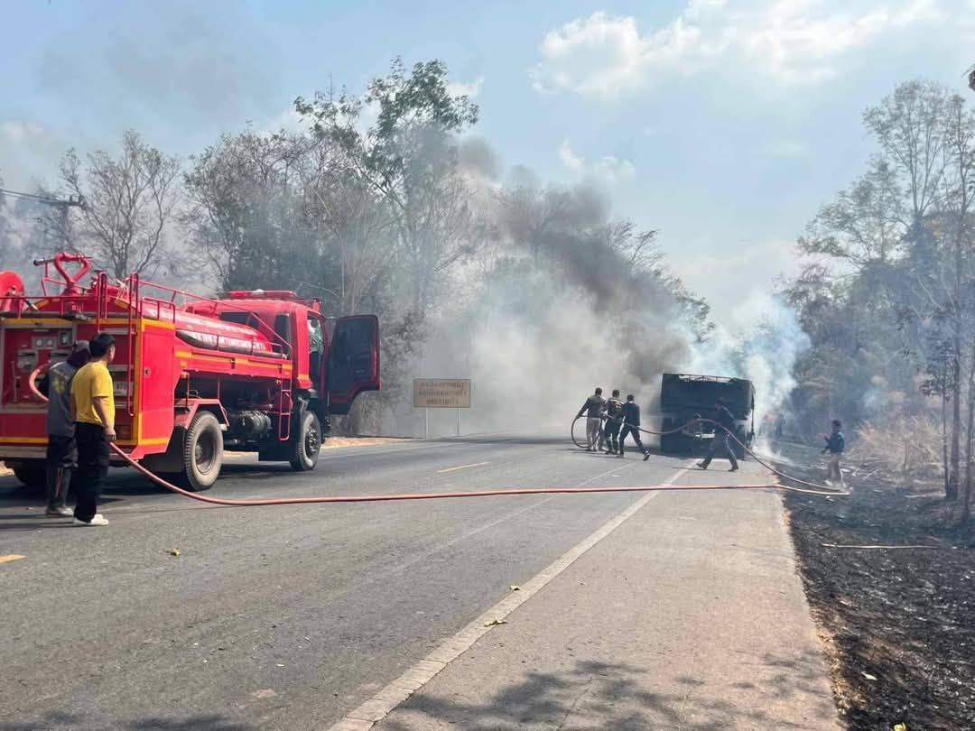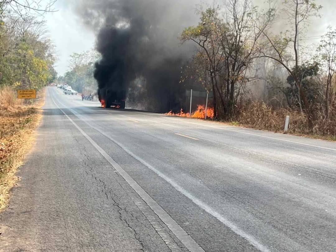 ไฟไหม้ลูกพ่วง ของรถบรรทุก แล้วลุกลามไหม้ป่าข้างทางที่อำเภอนครไทย เจ้าหน้าที่ระดมรถน้ำฉีดสกัด จ.พิษณุโลก