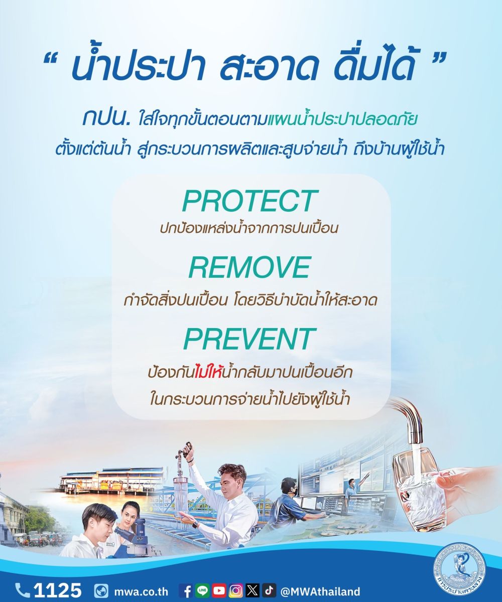 การประปานครหลวง (กปน.) ใส่ใจคุณภาพน้ำทุกขั้นตอนตั้งแต่ต้นน้ำจนถึงบ้านเรือนของประชาชน โดยใช้ 3 หลักการ คือ Protect ปกป้องแหล่งน้ำจากการปนเปื้อน, Remove กำจัดสิ่งปนเปื้อน โดยวิธีบำบัดน้ำให้สะอาด, Prevent ป้องกันน้ำไม่ให้น้ำ กลับมาปนเปื้อนอีก ในกระบวนการจ่ายน้ำ ไปยังผู้ใช้น้ำ เพื่อลดและป้องกันสิ่งปนเปื้อน ให้ประชาชนในพื้นที่บริการ ได้แก่ กรุงเทพมหานคร นนทบุรี และสมุทรปราการ กว่า 12 ล้านคน มีน้ำประปาสะอาดปลอดภัย เพื่อการอุปโภคบริโภคอย่างทั่วถึง และเพียงพอตลอด 24 ชั่วโมง
