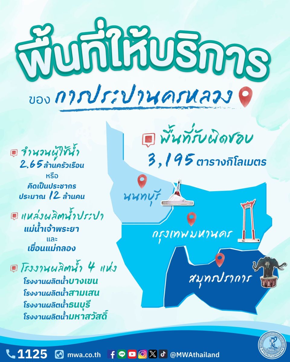 การประปานครหลวง (กปน.) ในฐานะหน่วยงานรัฐวิสาหกิจ สังกัดกระทรวงมหาดไทย มีหน้าที่ผลิตและให้บริการน้ำประปาสะอาด ปลอดภัย ดื่มได้อย่างมั่นใจในพื้นที่กรุงเทพมหานคร นนทบุรี และสมุทรปราการ กว่า 2.65 ล้านครัวเรือน หรือกว่า 12 ล้านคน ให้มีน้ำประปาสะอาดปลอดภัย เพื่อการอุปโภคบริโภคอย่างทั่วถึง และเพียงพอตลอด 24 ชั่วโมง ด้วยอัตรากำลังการผลิตน้ำมากถึง 6.3 ล้านลูกบาศก์เมตรต่อวัน จากโรงงานผลิตน้ำทั้ง 4 แห่ง คือ โรงงานผลิตน้ำบางเขน โรงงานผลิตน้ำมหาสวัสดิ์ โรงงานผลิตน้ำสามเสน และโรงงานผลิตน้ำธนบุรี รองรับการงานทั่วทั้งพื้นที่