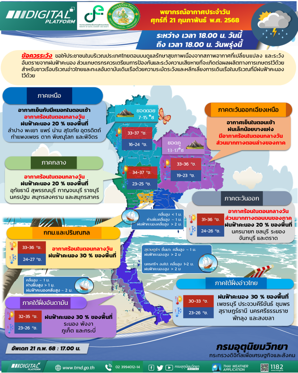 อนึ่ง ในช่วงวันที่ 23-25 ก.พ. 68 บริเวณความกดอากาศสูงหรือมวลอากาศเย็นกำลังปานกลางถึงค่อนข้างแรงจากประเทศจีนจะแผ่ลงมาปกคลุมภาคตะวันออกเฉียงเหนือและทะเลจีนใต้ ส่งผลทำให้มีลมใต้และลมตะวันออกเฉียงใต้พัดนำความชื้นจากทะเลจีนใต้และอ่าวไทยเข้ามาปกคลุมประเทศไทยตอนบน ประกอบกับจะมีคลื่นกระแสลมฝ่ายตะวันตกจากประเทศเมียนมาเคลื่อนผ่านภาคเหนือ ภาคตะวันออกเฉียงเหนือตอนบน และประเทศลาวตอนบน