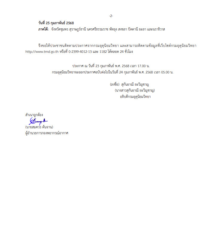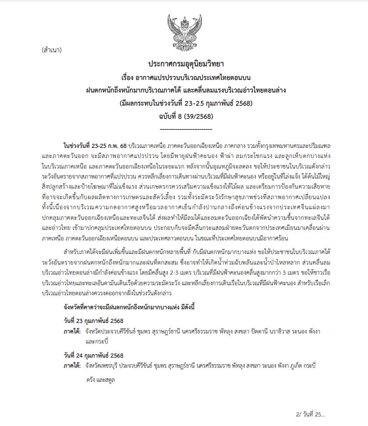 ประกาศกรมอุตุนิยมวิทยา เรื่อง อากาศแปรปรวนบริเวณประเทศไทยตอนบน ฝนตกหนักถึงหนักมากบริเวณภาคใต้ และคลื่นลมแรงบริเวณอ่าวไทยตอนล่าง (มีผลกระทบในช่วงวันที่ 23-25 กุมภาพันธ์ 2568 ฉบับที่ 8 (39/2568)