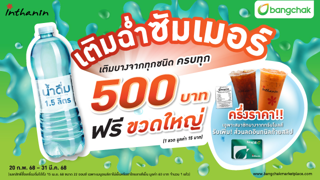 บางจากฯ จัดสมนาคุณต้อนรับหน้าร้อน “เติมฉ่ำ ซัมเมอร์” เมื่อเติมน้ำมันบางจากทุกชนิดครบทุก 500 บาท รับฟรีน้ำดื่มขวดใหญ่ 1.5 ลิตร 1 ขวด มูลค่า 15 บาท พิเศษ สำหรับสมาชิกบางจากกรีนไมลส์ รับเพิ่มอีกต่อ นำสลิปเติมน้ำมันแลกซื้อเครื่องดื่มอินทนิลเพียงครึ่งราคา (จากราคาปกติ 60 บาท) สำหรับอเมริกาโน่เย็น และชาไทยลาเต้เย็น จำนวน 1 แก้ว / สลิป ตั้งแต่ 20 กุมภาพันธ์ 2568 ถึง 31 มีนาคม 2568 ณ สถานีบริการน้ำมันบางจากและเอสโซ่เดิมทั่วประเทศที่ร่วมรายการ หรือสังเกตจากป้ายหน้าสถานีบริการน้ำมัน