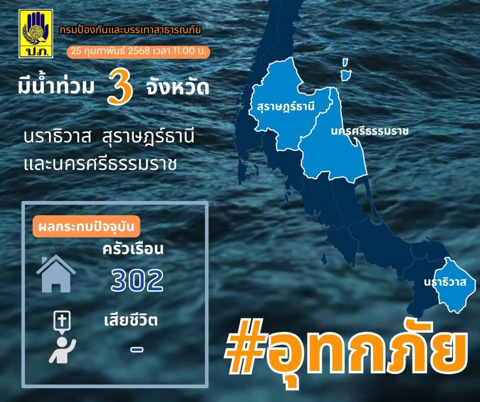 นายภาสกร บุญญลักษม์ อธิบดีกรมป้องกันและบรรเทาสาธารณภัย (ปภ.) เปิดเผยว่าจากสถานการณ์มรสุมตะวันออกเฉียงเหนือที่พัดปกคลุมอ่าวไทย ภาคใต้ และทะเลอันดามัน มีกำลังค่อนข้างแรง ทำให้ภาคใต้มีฝนตกหนักหลายพื้นที่ และมีฝนตกหนักมากบางแห่ง โดยระหว่างวันที่ 23 - 25 ก.พ. 68 ได้เกิดสถานการณ์อุทกภัยในพื้นที่ 3 จังหวัด ได้แก่ จังหวัดสุราษฎร์ธานี นครศรีธรรมราช และนราธิวาส รวม 7 อำเภอ 9 ตำบล 13 หมู่บ้าน ประชาชนได้รับผลกระทบ 302 ครัวเรือน ได้แก่