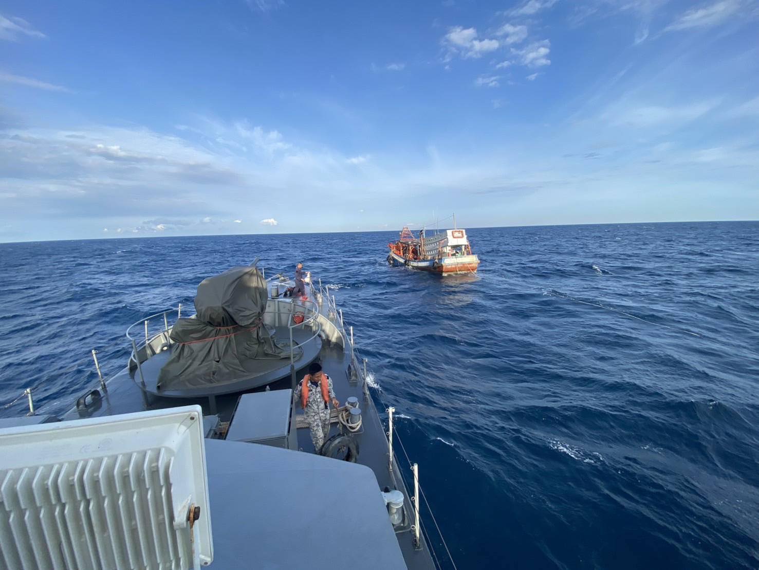 ทัพเรือภาคที่ 1/ศรชล.ภาค 1 จึงขอรับการสนับสนุนเรือในบัญชีกำลัง ศรชล.ภาค 1 จาก กองบัญชาการป้องกันชายแดนจันทบุรีและตราด (กปช.จต.) โดยเป็นเรือในหมวดเรือลาดตระเวนชายแดน (มชด./1) และอากาศยานจากหมวดบินเฉพาะกิจ กองเรือปฏิบัติการ ทัพเรือภาคที่ 1 ในการตรวจสอบในพื้นที่และกลุ่มเรือประมงดังกล่าว ซึ่ง กองบัญชาการป้องกันชายแดนจันทบุรีและตราด (กปช.จต.) ให้การสนับสนุน เรือหลวงเทพา และ เรือตรวจการณ์ 264 พร้อมด้วย ทัพเรือภาคที่ 1 จัดเครื่องบินตรวจการณ์ชี้เป้า แบบที่ 1 (บ.ตช.1) สนับสนุน สามารถจับกุมเรือประมงต่างชาติ ได้จำนวน 1 ลำ พร้อม ลูกเรือจำนวน 4 คน ส่วนที่เหลือเร่งเครื่องและหันทิศทางหนีของนอกเขตเศษฐกิจจำเพาะของประเทศไทย ในเช้ามืดของวันนี้ (25 ก.พ.68) และได้ร่วมกันตรวจสอบสอบสวนเบื้องต้นและส่งต่อให้ฝ่ายกฎหมายฯ และเจ้าหน้าที่ตำรวจคลองใหญ่ดำเนินการต่อไป โดยมีการร่วมแถลงข่าวการจับกุม ณ ท่าเรือเอนกประสงค์คลองใหญ่ อ.คลองใหญ่ จ.ตราด ในเย็นวันนี้ (25 ก.พ.68) โดย พลเรือโท อาภา ชพานนท์ ผู้อำนวยการศูนย์อำนวยการรักษาผลประโยชน์ของชาติทางทะเลภาค 1 ผู้บัญชาการทัพเรือภาคที่ 1 พร้อมด้วย พลเรือตรี ไชยนันท์ ชูใหม่ รองผู้อำนวยการศูนย์อำนวยการรักษาผลประโยชน์ของชาติทางทะเลภาค 1 และตัวแทนจากหน่วยงานผู้ร่วมปฏิบัติส่วนต่าง ๆ