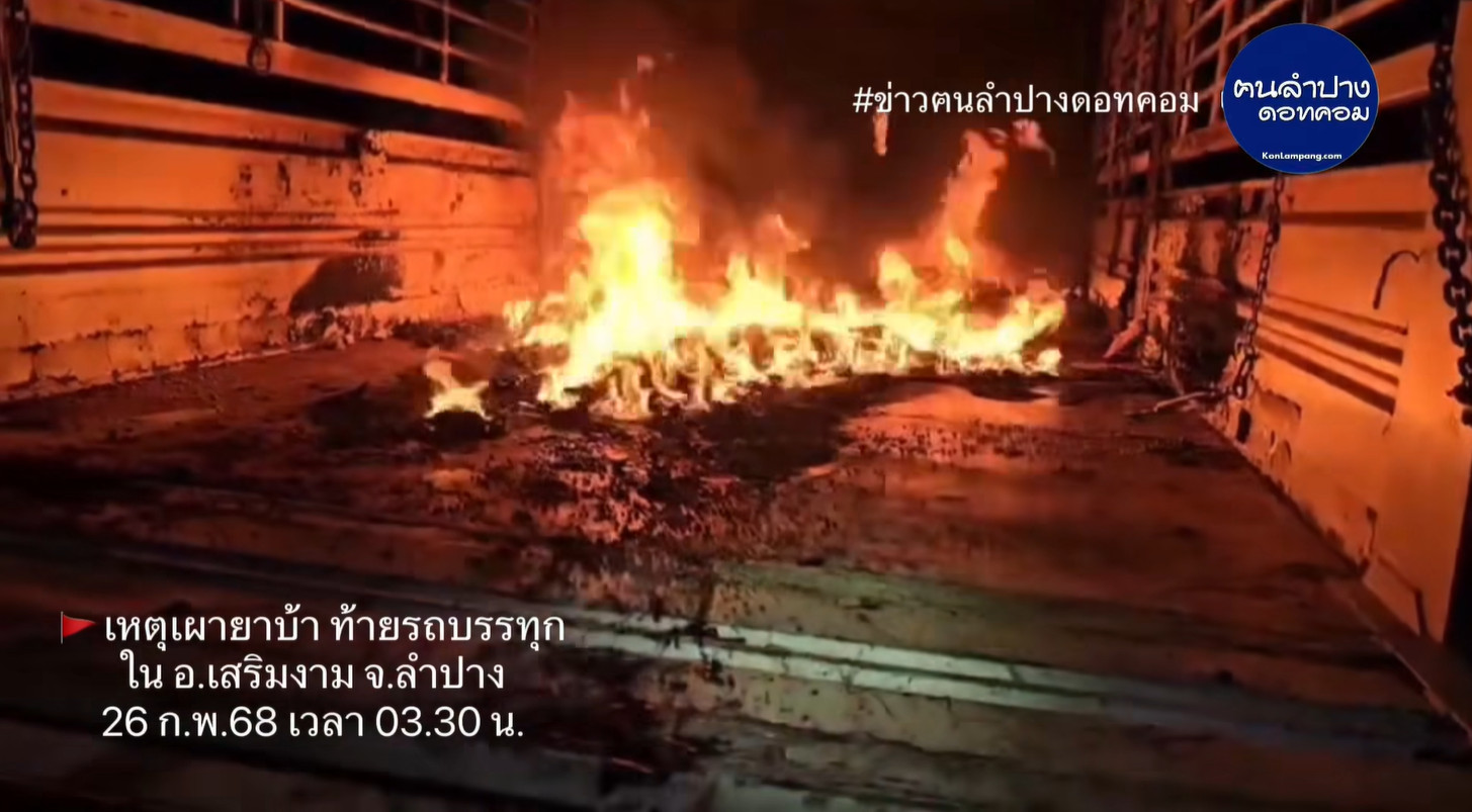 (26 ก.พ.68) เจ้าหน้าที่ตำรวจ สภ.เสริมงาม ได้รับแจ้งจากศูนย์วิทยุ 191 ภ.จว.ลำปาง ให้ร่วมตรวจสอบ รถบรรทุกต้องสงสัยมีไฟไหม้บริเวณท้ายกระบะ จากนั้น ร้อยเวร 20 จึงได้ ประสานกับชุด เจ้าหน้าที่ตำรวจ บช.ปส. เพื่อเข้าตรวจสอบรถบรรทุกคันดังกล่าว ซึ่งมาจอดบริเวณที่เกิดเหตุ ส่วนคนขับได้วิ่งหลบหนีไป