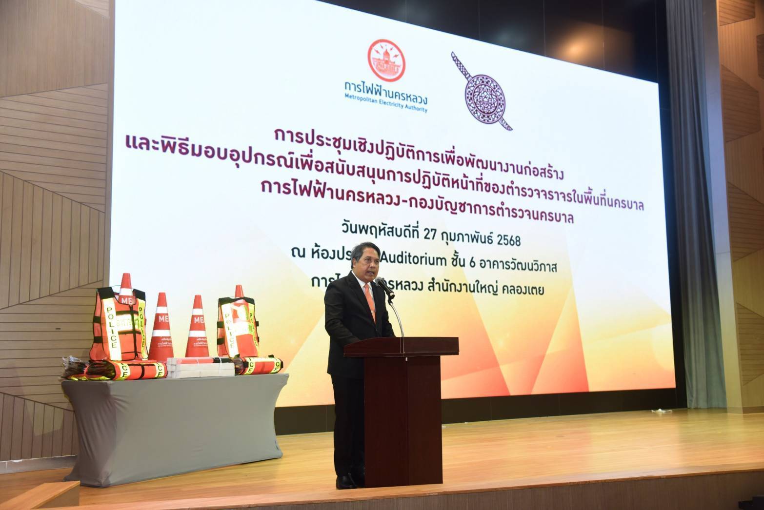 วันนี้ (27 กุมภาพันธ์ 2568) MEA หรือการไฟฟ้านครหลวงจัดการประชุมเชิงปฏิบัติการ เพื่อพัฒนางานก่อสร้าง โดยมีนายฐิติวุฒิ เงินคล้าย รองผู้ว่าการ MEA หรือการไฟฟ้านครหลวง เป็นผู้บรรยาย พร้อมเป็นผู้แทนมอบอุปกรณ์ให้แก่ พันตำรวจเอกสมโภชน์ สุวรรณจรัส รองผู้บังคับการตำรวจนครบาล 5 ผู้แทนจากกองบัญชาการตำรวจนครบาล เพื่อสนับสนุนการปฏิบัติหน้าที่ของตำรวจจราจรในพื้นที่นครบาล ณ ห้องประชุม Auditorium ชั้น 6 อาคารวัฒนวิภาส การไฟฟ้านครหลวง สำนักงานใหญ่ คลองเตย