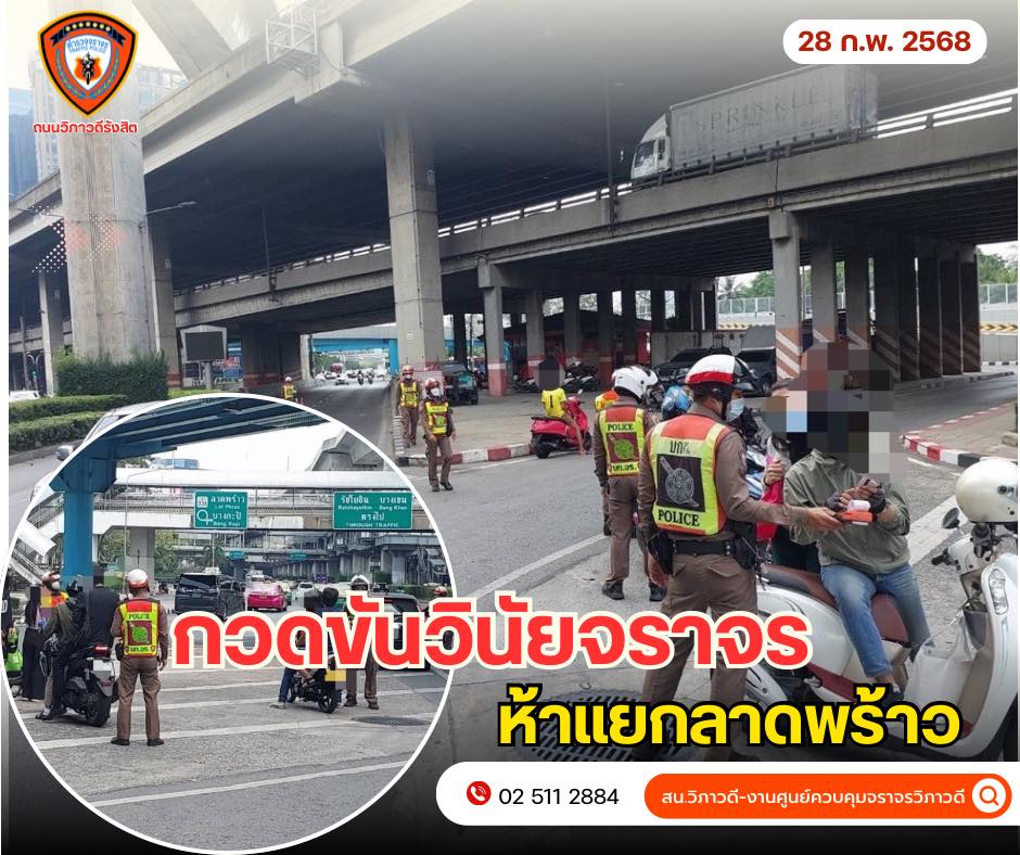 28 ก.พ.2568 สน.วิภาวดี-งานศูนย์ควบคุมจราจรวิภาวดีรังสิต ได้มีการตั้งจุดกวดขันวินัยจราจรและบังคับใช้กกฎหมาย เพื่อลดอุบัติเหตุบนท้องถนนและป้องกันการการเกิดเหตุรุนแรงในพื้นที่ อีกทั้งให้เคารพกฎวินัยจราจร โดยวันนี้ ทาง สน.วิภาวดีฯ มีการเปรียบเทียบปรับ ขับรถย้อนศร, ฝ่าฝืนสัญญาณจราจร, ไม่คาดเข็มขัดนิรภัย, ไม่มีใบขับขี่, แซงในที่คับขัน, ไม่สวมหมวกนิรภัย, มอเตอร์ไซค์ไม่ปลอดภัย, ใช้โทรศัพท์มือถือขณะขับรถ เพื่อความปลอดภัย ของผู้ใช้ทาง จำนวนรวมกว่า 100 ราย