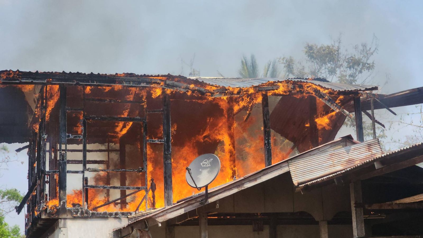 เพลิงไหม้บ้านวอดทั้งหลัง เจ้าของบ้านพยายามเข้าไปขนทรัพย์สิน โชคดีเพื่อนบ้านช่วยนำตัวออกมาได้อย่างปลอดภัย