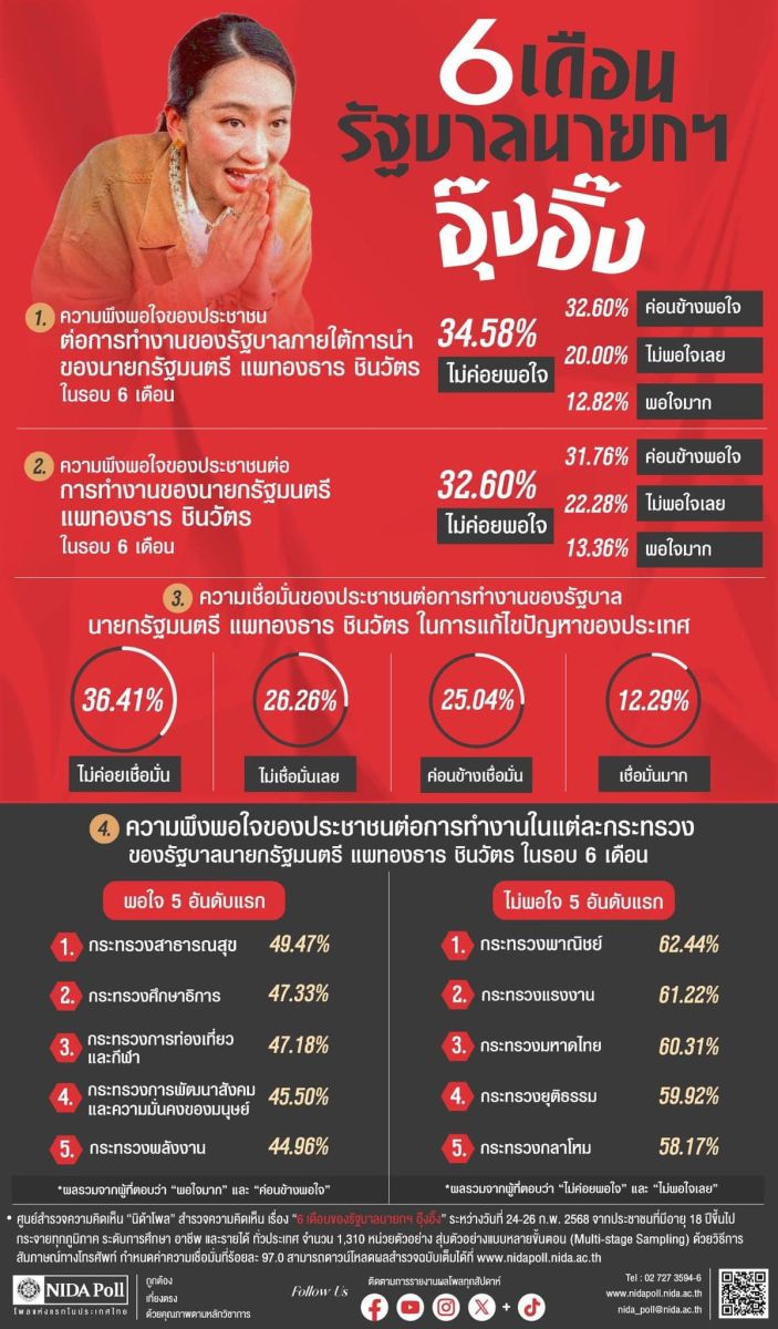 ศูนย์สำรวจความคิดเห็น “นิด้าโพล” สถาบันบัณฑิตพัฒนบริหารศาสตร์ (นิด้า) เปิดเผยผลการสำรวจของประชาชน เรื่อง “6 เดือน รัฐบาลนายกฯ อุ๊งอิ๊ง” ทำการสำรวจระหว่างวันที่ 24-26 ก.พ. จากประชาชนที่มีอายุ 18 ปีขึ้นไป กระจายทุกภูมิภาค ระดับการศึกษา อาชีพ และรายได้ ทั่วประเทศ รวมจำนวนทั้งสิ้น 1,310 หน่วยตัวอย่าง เกี่ยวกับความพึงพอใจต่อการทำงานของรัฐบาลนายกรัฐมนตรี แพทองธาร ชินวัตร ในรอบ 6 เดือน
