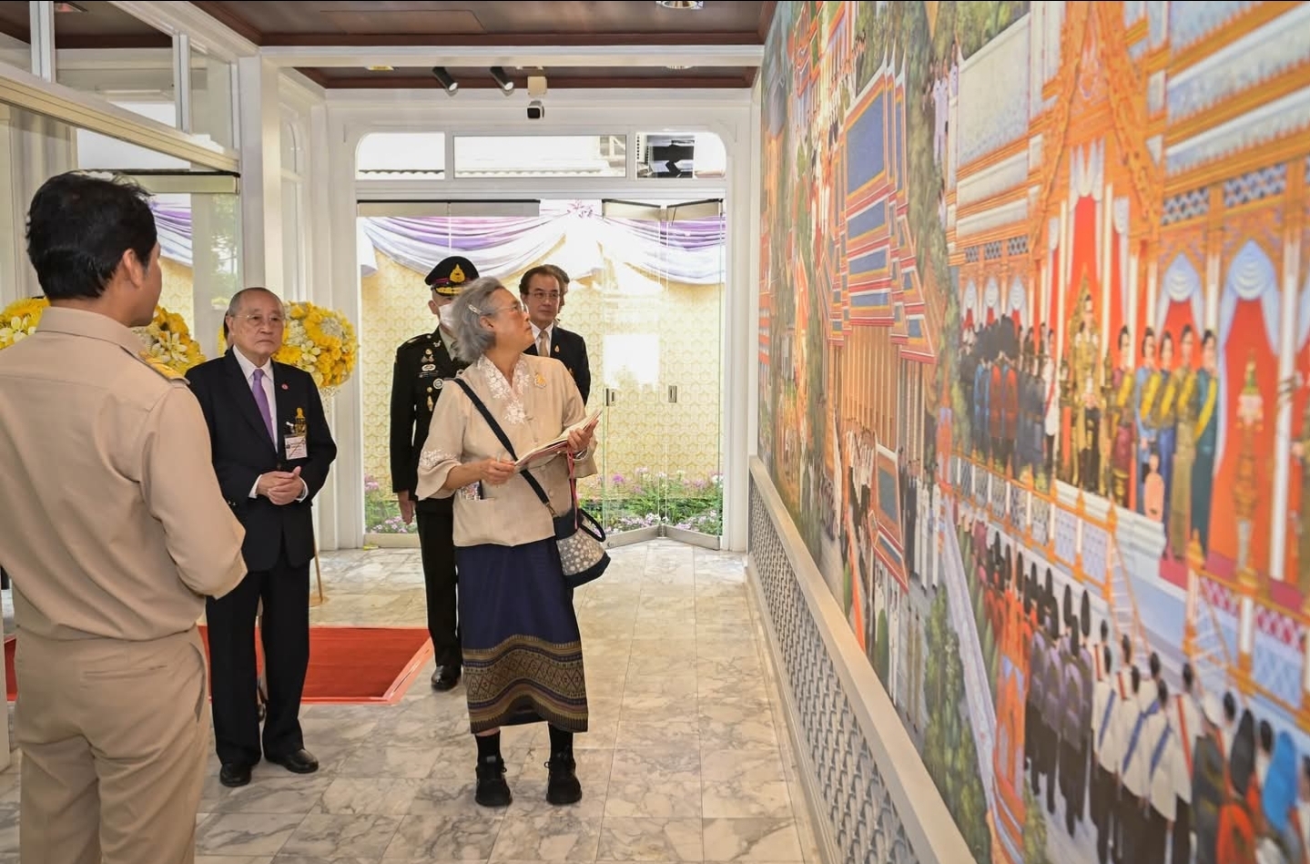 (3 มี.ค. 68) สมเด็จพระกนิษฐาธิราชเจ้า กรมสมเด็จพระเทพรัตนราชสุดา ฯ สยามบรมราชกุมารี เสด็จพระราชดำเนินไปทรงเปิดและทอดพระเนตรโครงการภาพจิตรกรรมฝาผนัง พระระเบียง ณ วัดพระราม ๙ กาญจนาภิเษก เขตห้วยขวาง กรุงเทพมหานคร ในการนี้ นายชัชชาติ สิทธิพันธุ์ ผู้ว่าราชการกรุงเทพมหานคร พญ.วันทนีย์ วัฒนะ ปลัดกรุงเทพมหานคร ผู้อำนวยการสำนักการศึกษา ผู้บริหารสำนักพัฒนาสังคม ผู้อำนวยการเขตห้วยขวาง เฝ้าฯ รับเสด็จฯ