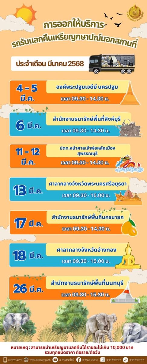 "กรมธนารักษ์" จัดรถเคลื่อนที่ ให้บริการรับแลกคืนเหรียญกษาปณ์แก่ประชาชน ประจำเดือน มี.ค. 68 เพื่อกระตุ้นให้เหรียญกษาปณ์เกิดการหมุนเวียนเพิ่มมากขึ้น สัญจร 7 จังหวัด