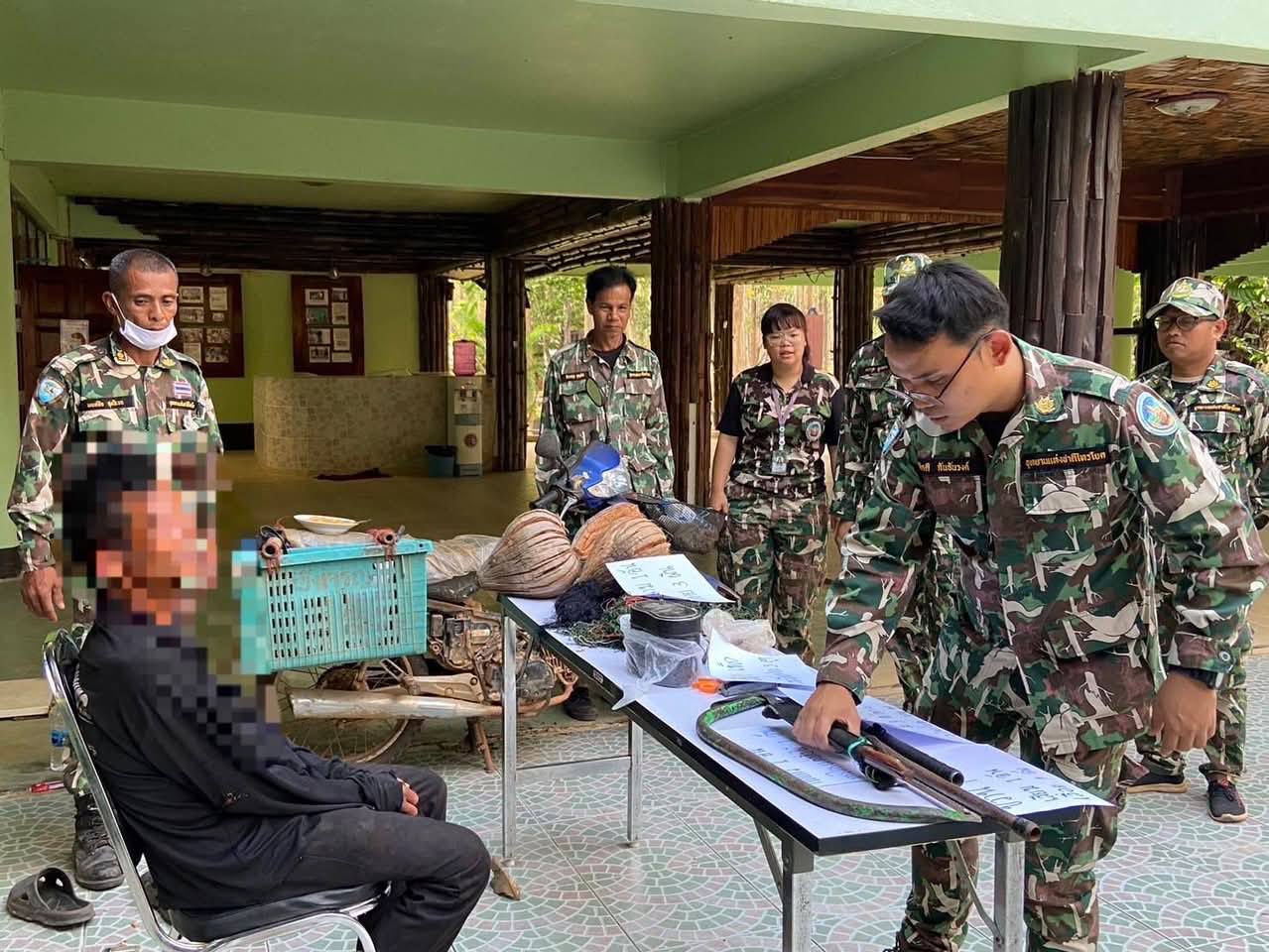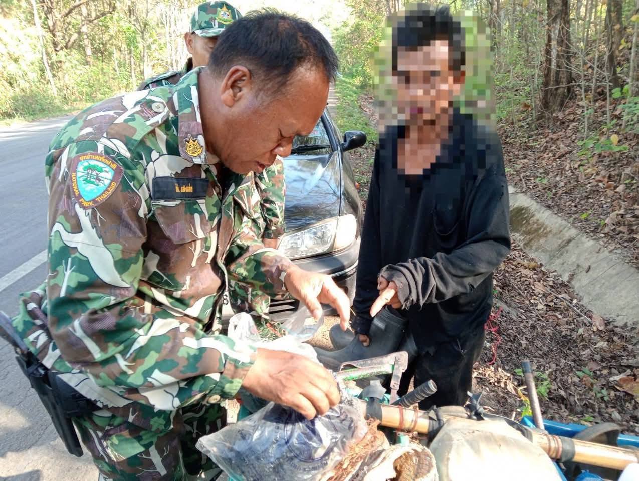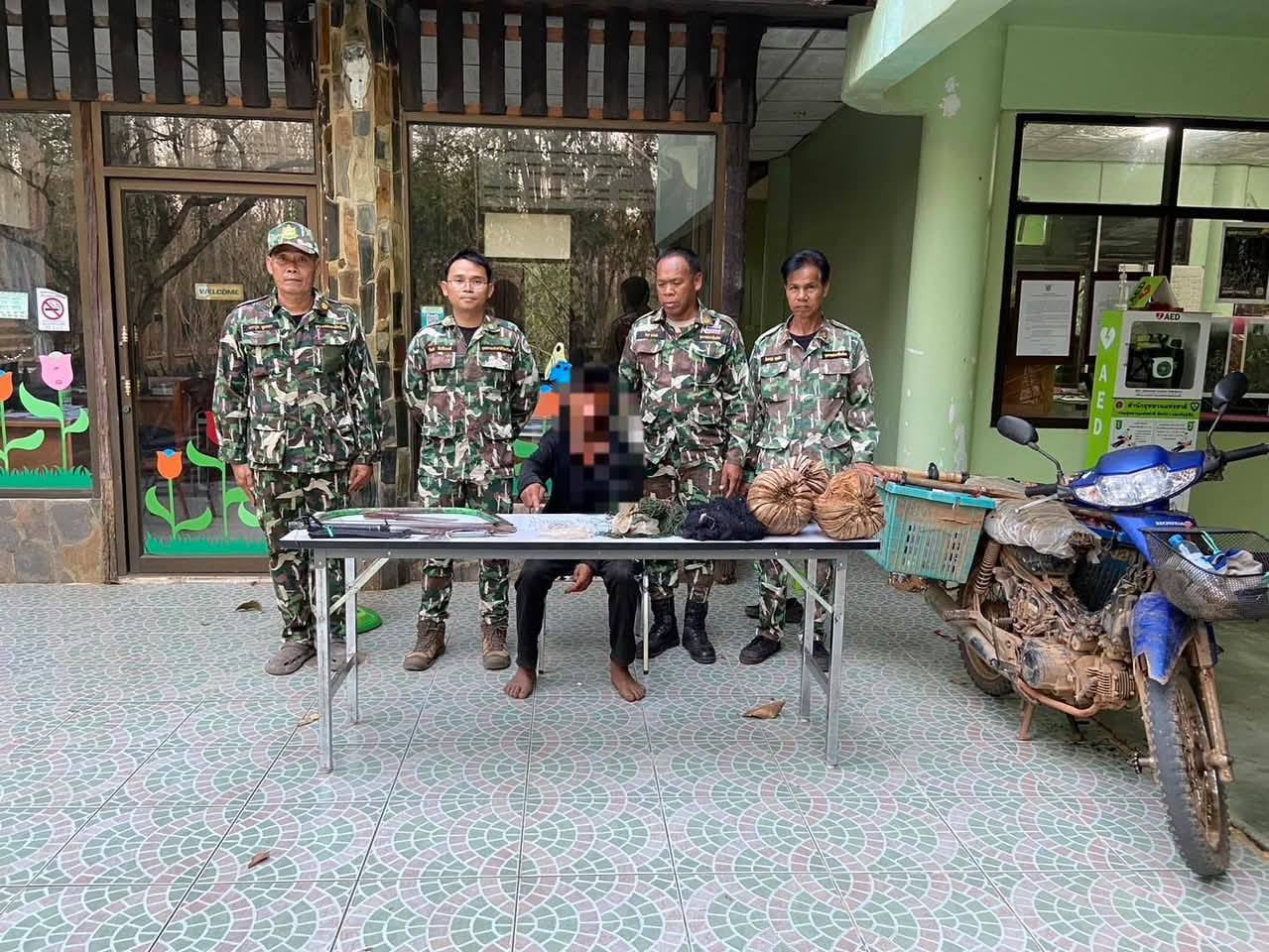ผู้ต้องหาคือ ชายอายุ 50 ปี ชาวบ้านตำบลไทรโยค อำเภอไทรโยค จังหวัดกาญจนบุรี ในที่เกิดเหตุเจ้าหน้าที่ยังพบรถจักรยานยนต์ 1 คัน พร้อมอุปกรณ์ที่ใช้ในการกระทำความผิด ประกอบด้วย ขวาน 1 เล่ม เสียม 1 อัน มีดพกสั้น 1 เล่ม เลื่อยโค้ง 1 อันกรรไกรตัดกิ่ง 1 อัน เชือกตาข่าย 3 ผืน กาบมะพร้าว 3 ลูก และไฟแช็คสีขาว 1 อัน