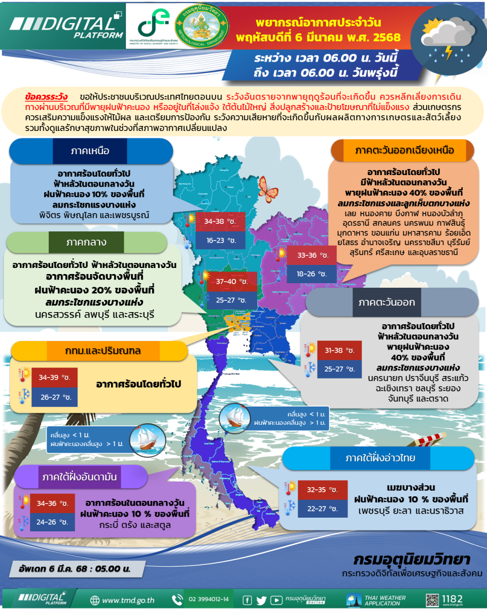 ทั้งนี้เนื่องจากบริเวณความกดอากาศสูงหรือมวลอากาศเย็นกำลังปานกลางที่ปกคลุมประเทศลาวตอนบนและประเทศเวียดนามตอนบนจะแผ่ลงมาปกคลุมภาคตะวันออกเฉียงเหนือและทะเลจีนใต้ในวันนี้ (6 มี.ค. 68) ในขณะที่ความกดอากาศต่ำเนื่องจากความร้อนปกคลุมประเทศไทยตอนบน ประกอบกับมีลมใต้และลมตะวันออกเฉียงใต้พัดปกคลุมบริเวณดังกล่าว