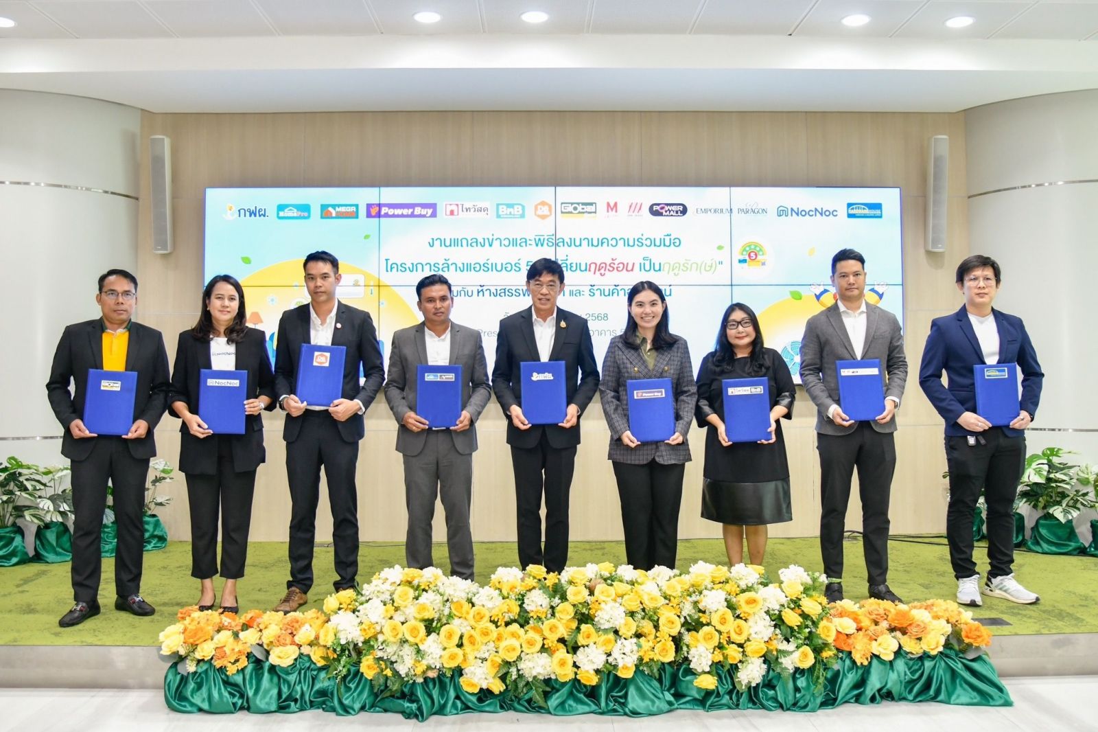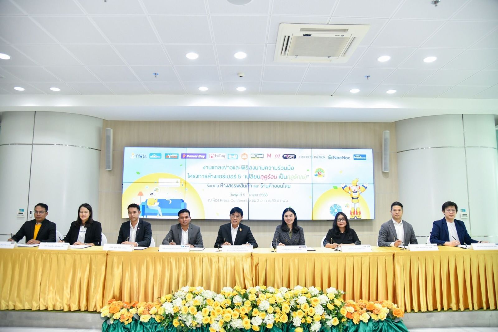 เมื่อวันที่ 5 มีนาคม 2568 นายเทพรัตน์ เทพพิทักษ์ ผู้ว่าการการไฟฟ้าฝ่ายผลิตแห่งประเทศไทย (กฟผ.) ร่วมลงนามบันทึกข้อตกลงความร่วมมือโครงการล้างเครื่องปรับอากาศเบอร์ 5 ภายใต้แคมเปญ "เปลี่ยนฤดูร้อน เป็นฤดูรัก(ษ์)" กับผู้แทนจากห้างสรรพสินค้าและร้านค้าออนไลน์ชั้นนำ มอบส่วนลดค่าล้างเครื่องปรับอากาศ 200 บาท สำหรับเครื่องปรับอากาศติดฉลากประหยัดไฟฟ้าเบอร์ 5 ขนาดไม่เกิน 24,000 บีทียู จำนวน 15,000 สิทธิ์