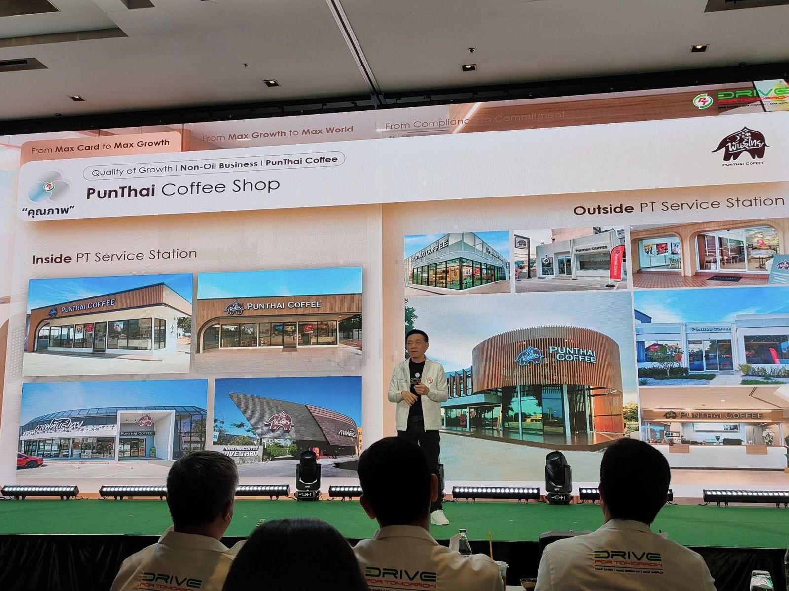 2. ขยายธุรกิจ Non-Oil ให้"เติบโต"โดยตั้งเป้าสัดส่วนกำไรขั้นต้นในธุรกิจ Non-Oil เพิ่มขึ้นเป็น 50% ภายในปี 2571 ธุรกิจอาหารและเครื่องดื่มจะเพิ่มขึ้นเป็น 25% ของกำไรขั้นต้น พร้อมกับธุรกิจ Non-Oil อื่น ๆ อีก 25% โดยการเพิ่มในธุรกิจอาหารและเครื่องดื่ม มีปัจจัยมาจากการขยายกาแฟพันธุ์ไทยสู่ 5,000 สาขา ภายในปี พ.ศ. 2571 การขยายสาขานี้จะทำให้กาแฟพันธ์ไทยเข้าถึงชุมชมและเป็นส่วนหนึ่งของการพัฒนาเศรษฐกิจท้องถิ่น ในมุมธุรกิจใหม่ Subway ได้เข้ามาเป็นส่วนหนึ่งของระบบนิเวศธุรกิจของ PTG ผ่านบัตร Max Card โดยใช้ประโยชน์จากฐานสมาชิกกว่า 25 ล้านราย เพื่อมอบความคุ้มค่าและสิทธิประโยชน์ที่ตอบโจทย์ไลฟ์สไตล์ของลูกค้ามากยิ่งขึ้น