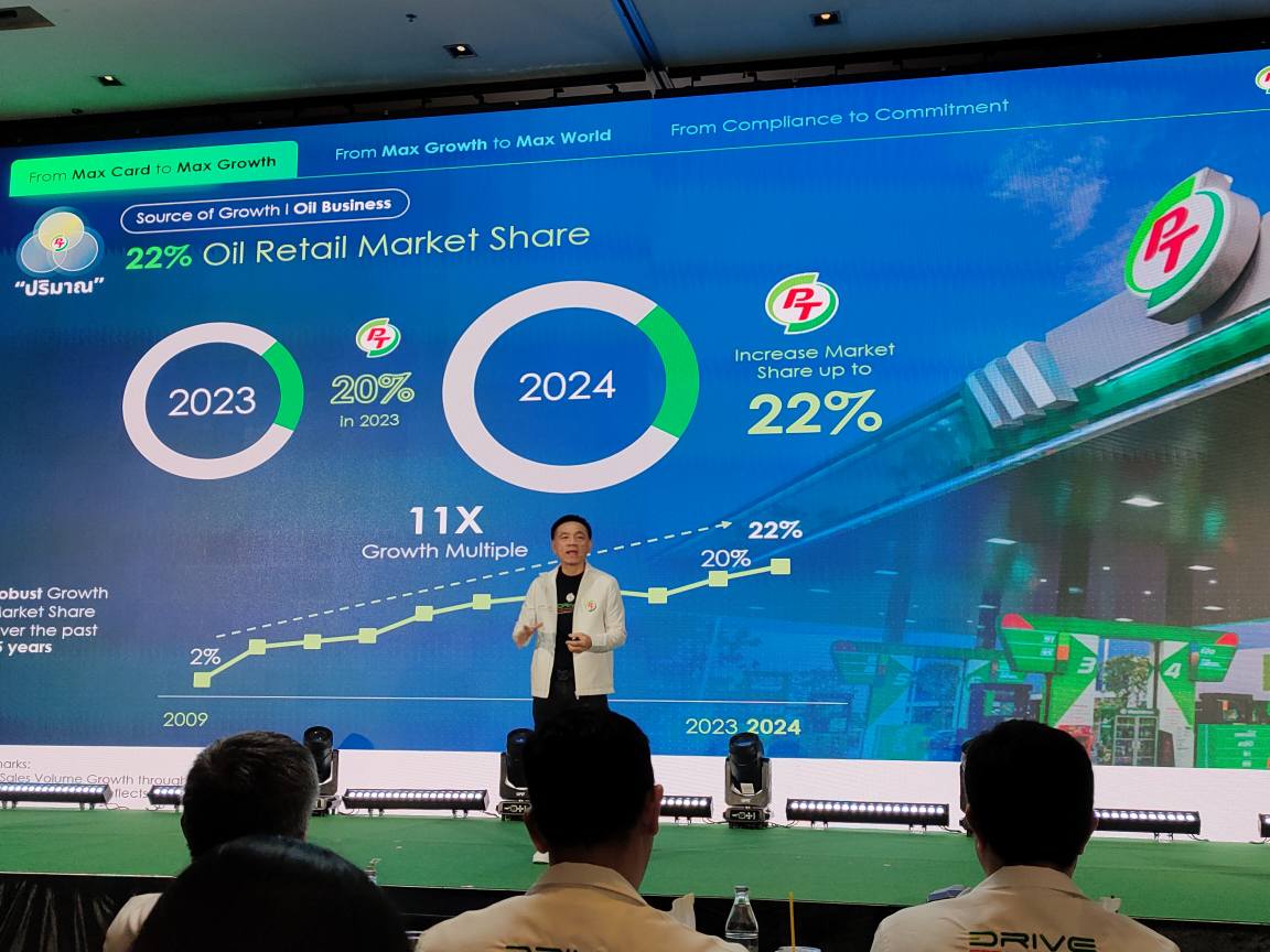 คุณพิทักษ์ รัชกิจประการ ประธานเจ้าหน้าที่บริหารและกรรมการผู้จัดการใหญ่ บริษัท พีทีจี เอ็นเนอยี จำกัด (มหาชน) หรือ PTG เปิดเผยในงาน " PTG Drive for Tomorrow: Max Card. Max Growth. Max World." ว่าปี 2567 ที่ผ่านมา PTG สามารถสร้างการเติบโตได้อย่างแข็งแกร่ง โดยมี PT Max Card และ PT Max Card Plus กว่า 25 ล้านสมาชิก (คิดเป็น 1 ใน 3 ของประชากรไทย)เป็นกุญแจสำคัญที่ผลักดันให้ธุรกิจเติบโตอย่างก้าวกระโดดทั้งในด้านปริมาณ คุณภาพ และกลยุทธ์ ธุรกิจ Oil ของ PTG ทำสถิติใหม่ด้านปริมาณการจำหน่ายน้ำมันสูนสูงสุดเป็นประวัติการณ์ที่6,548 ล้านลิตร เติบโต 12.9% สูงกว่าอัตราการเติบโตของอุตสาหกรรมกว่า 10 เท่า (ตลาดเติบโต 0.4%) พร้อมครองส่วนแบ่งตลาดเพิ่มขึ้นเป็น 21.9% จาก Same-Store Sales Growth (SSSG) กว่า 11.6% โดยมี PT Max Card เป็นตัวขับเคลื่อนหลัก ดึงดูดลูกค้าให้กลับมาเติมน้ำมันมากขึ้น บ่อยขึ้นและต่อเนื่องขึ้น นอกจากปริมาณที่เติบโตขึ้นแล้ว PTG ยังให้ความสำคัญกับคุณภาพของผลิตภัณฑ์และบริการ โดยเน้นโครงการหัวจ่ายน้ำมันเชื้อเพลิงมาตรฐาน และคุณภาพการบริการ เช่น บริการส่งน้ำมัน Max Service การเช็ดกระจก การดูแลลูกค้า พร้อมกลยุทธ์การเติบโตควบคู่ไปกับลูกค้า ชุมชน และ คู่คู่ค้า ผ่านการพัฒนา Max Enterprise Connect (MEC) โซลูซันสำหรับลูกค้าองค์กร และร่วมมือกับกรมการค้าภายใน เพื่อสร้างคุณค่าร่วมกับภาครัฐและชุมชน อีกทั้งได้พัฒนาและปรับปรงสถานีบริการให้เป็น One-Stop Destination รองรับพฤติกรรมผู้บริโภคที่เปลี่ยนแปลงอย่างรวดเร็วให้ทุกสถานีกลายเป็นมากกว่าสถานีเติมน้ำมัน