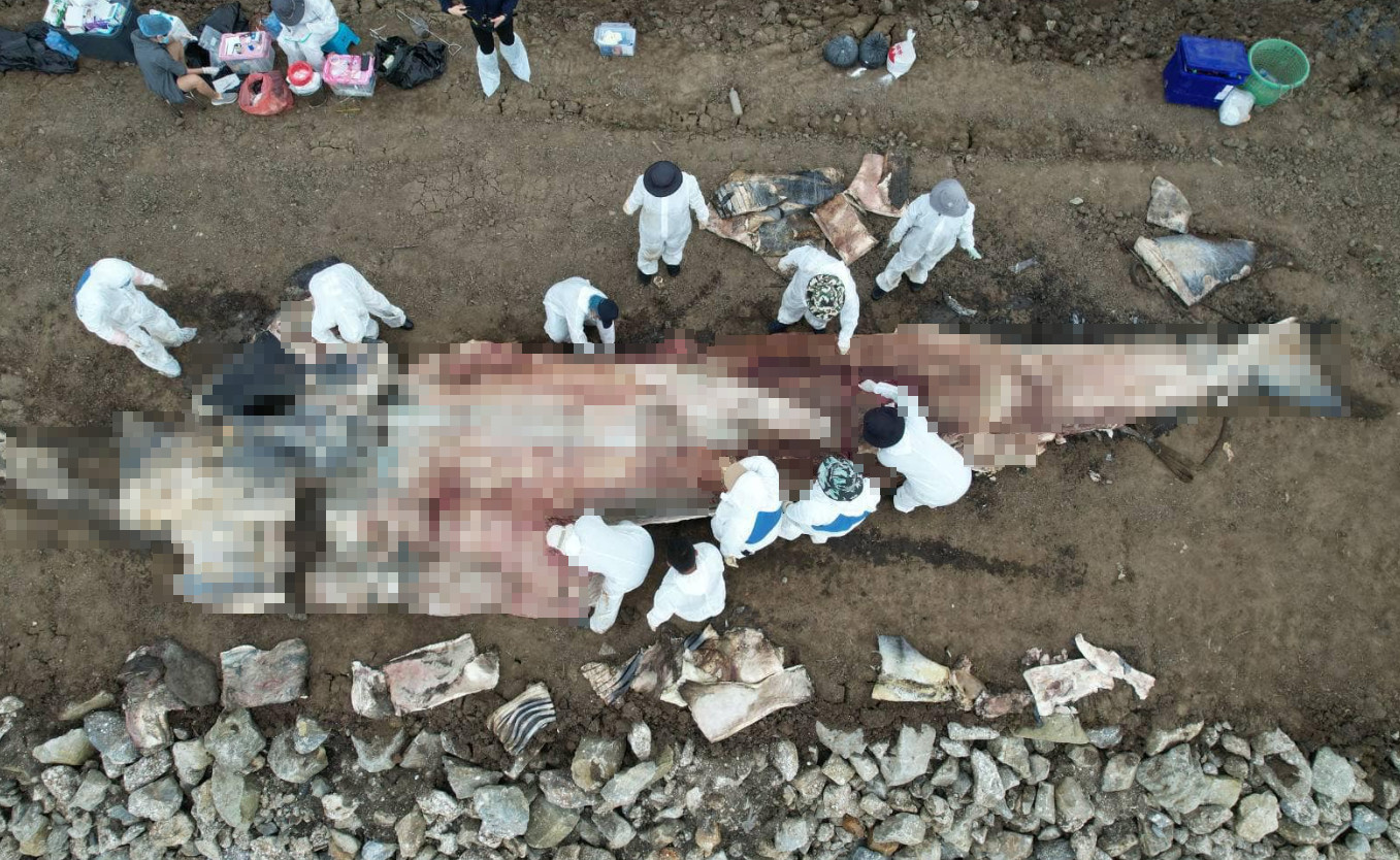เมื่อวันที่ 8 มีนาคม 2568 ดร.ปิ่นสักก์ สุรัสวดี อธิบดีกรมทรัพยากรทางทะเลและชายฝั่ง (อทช.) กล่าวว่า กรมทรัพยากรทางทะเลและชายฝั่ง โดยศูนย์วิจัยทรัพยากรทางทะเลและชายฝั่งอ่าวไทยตอนบน (ศวทบ.) ร่วมกับเครือข่ายรักษ์อ่าวไทยตอนบน เจ้าหน้าที่ศูนย์วิจัยและพัฒนาประมงทะเลสมุทรปราการ กรมประมง องค์การพิพิธภัณฑ์วิทยาศาสตร์ และอาสาสมัคร ร่วมลงพื้นที่ชันสูตรซากวาฬบรูด้าที่ได้รับแจ้งเกยตื้น จากเพจที่นี่สมุทรปราการ เมื่อวันที่ 7 มีนาคม 2568 พบเป็นวาฬบรูด้า (Bryde's whale: Balaenoptera edeni) วัยรุ่น อายุไม่เกิน 3 ปี ตายมาเเล้วประมาณ 3 วัน เพศเมีย สภาพซากเน่า ผิวหนังหลุดลอก