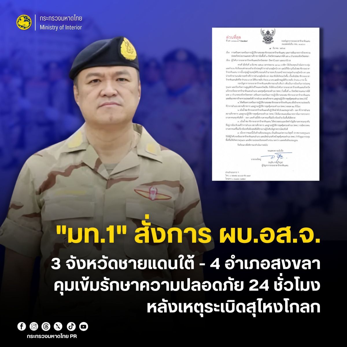 วันนี้ (10 มี.ค.68) นาย อนุทิน ชาญวีรกูล รองนายกรัฐมนตรีและรมว.มหาดไทย ในฐานะผู้บัญชาการกองอาสารักษาดินแดน ได้มีหนังสือสั่งการไปยังผู้ว่าราชการจังหวัดสงขลา ปัตตานี ยะลา และนราธิวาส ในฐานะผู้บังคับการกองอาสารักษาดินแดนจังหวัด เพิ่มมาตรการรักษาความปลอดภัยในพื้นที่ หลังเกิดเหตุคนร้ายก่อเหตุรจังหวัดนราธิวาส เมื่อช่วงค่ำของวันที่ 8 มี.ค. ที่ผ่านมา ส่งผลให้สมาชิกกองอาสารักษาดินแดน (อส.) เสียชีวิต 2 นาย บาดเจ็บ 8 นาย และมีประชาชนได้รับบาดเจ็บอีก 4 ราย