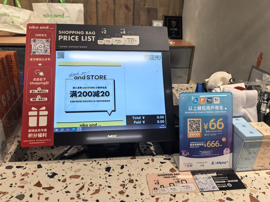 (แฟ้มภาพซินหัว : จุดชำระเงินที่ศูนย์การค้าแห่งหนึ่งในเมืองเฉิงตู มณฑลซื่อชวนทางตะวันตกเฉียงใต้ของจีน)