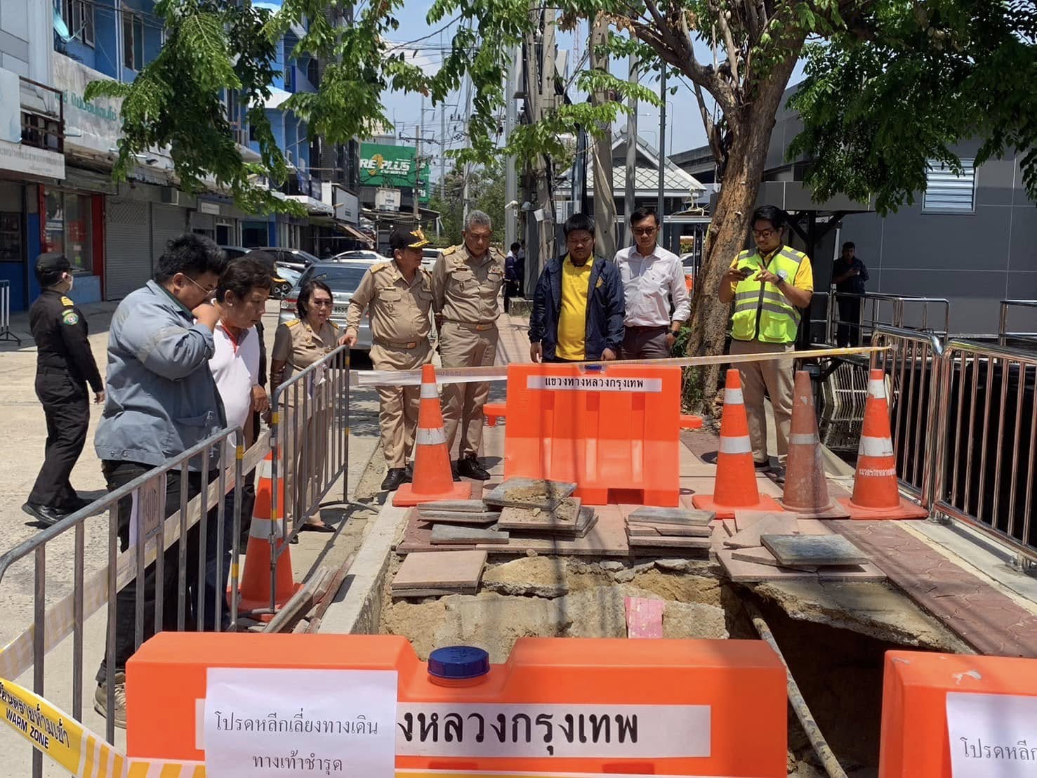 วันจันทร์ที่ 10 มีนาคม 2568 นายสายชล จังสมยา ผู้อำนวยการเขตพญาไท พร้อมด้วย จ่าเอกคมกริช คุ้มมงคล ผู้ช่วยผู้อำนวยการเขต นางณัฏฐ์ชฎามณฑ์ ชัยอำนาจ ผู้ช่วยผู้อำนวยการเขต หัวหน้าฝ่ายเทศกิจ และหัวหน้าฝ่ายรักษาความสะอาดฯ ร่วมกับกรมทางหลวง การประปานครหลวง ลงพื้นที่ตรวจสอบพบว่าทางเท้าที่กรมทางหลวงเป็นผู้ดำเนินการ ปรับปรุงได้เกิดทรุดตัวเป็นหลุม ขนาดกว้างประมาณ 2.50 เมตร ยาว 3 เมตร ลึก 1 เมตร สำนักงานเขตพญาไทจึงได้นำแผงเหล็กมากั้นโดยรอบเพื่อป้องกันเหตุอันตราย เพื่อความปลอดภัยของประชาชนที่สัญจรไปมา