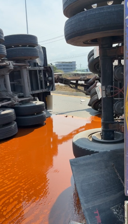 12.15 น. ถนนสุขุมวิท ขาออก บริเวณร้านอาหารตามสั่งกู้ภัยน้อง อ.บางปะกง จ.ฉะเชิงเทรา รถพ่วงเสียหลักพลิกตะแคง รถติด