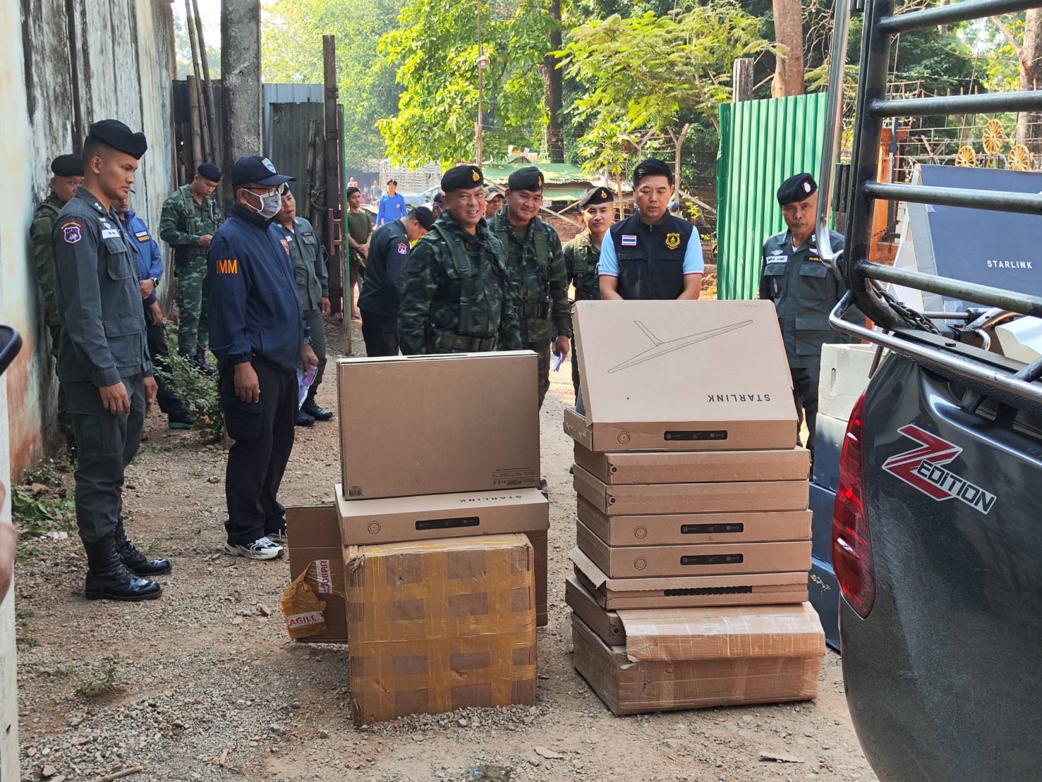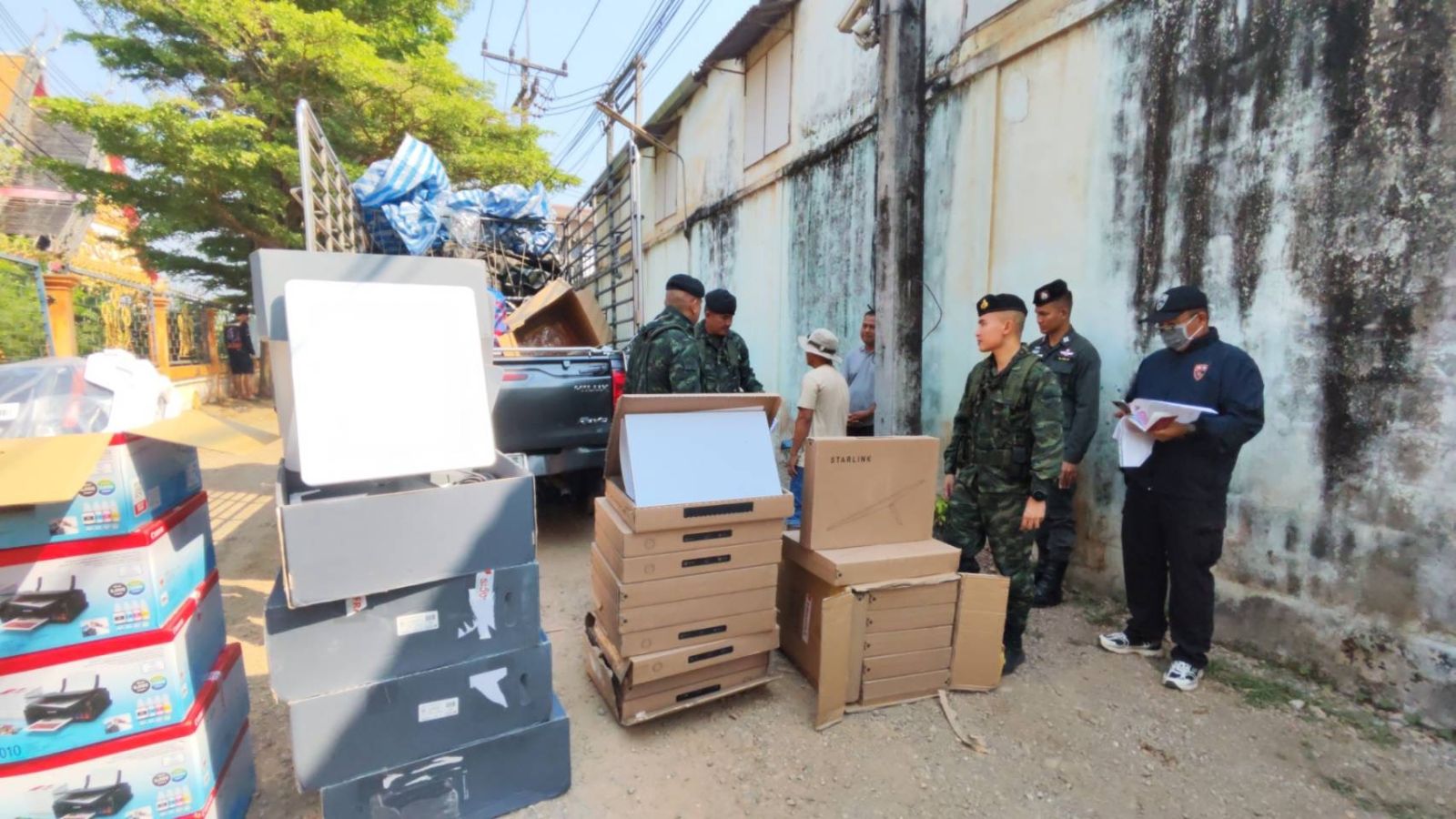โดยในวันนี้ ระหว่างกำลังพลปฎิบัติหน้าที่ในการตั้งจุดตรวจ จุดสกัดความมั่นคง บริเวนช่องทางซอยเกษตร 1 บ้านพระเจดีย์สามองค์ ม.9 ต.หนองลู อ.สังขละบุรี จ.กาญจนบุรี ในพื้นที่ พบรถกระบะโตโยต้า มีบุคคลซึ่งไม่มีสัญชาติไทย อายุ 33 ปี เป็นผู้ขับขี่ มีท่าทีมีพิรุธ จึงขอตรวจค้น พบเป็นอุปกรณ์ รับ-ส่ง สัญญาณอินเทอร์เน็ต STARLINK จำนวน 21 เครื่อง และ เครื่องปริ้นเตอร์ จำนวน 4 เครื่อง