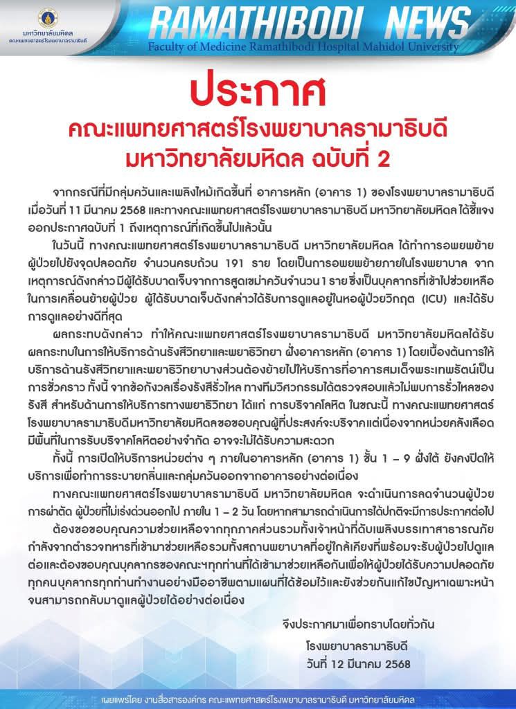 12 มีนาคม 2568 เพจ "คณะแพทยศาสตร์โรงพยาบาลรามาธิบดี Faculty of Medicine Ramathibodi Hospital" ออกประกาศ คณะแพทยศาสตร์โรงพยาบาลรามาธิบดี มหาวิทยาลัยมหิดล ฉบับที่ 2 ระบุว่า จากกรณีที่มีกลุ่มควันและเพลิงไหม้เกิดขึ้นที่ อาคารหลัก (อาคาร 1) ของโรงพยาบาลรามาธิบดี เมื่อวันที่ 11 มีนาคม 2568 และทางคณะแพทยศาสตร์โรงพยาบาลรามาธิบดี มหาวิทยาลัยมหิดล ได้ชี้แจงออกประกาศฉบับที่ 1 ถึงเหตุการณ์ที่เกิดขึ้นไปแล้วนั้น