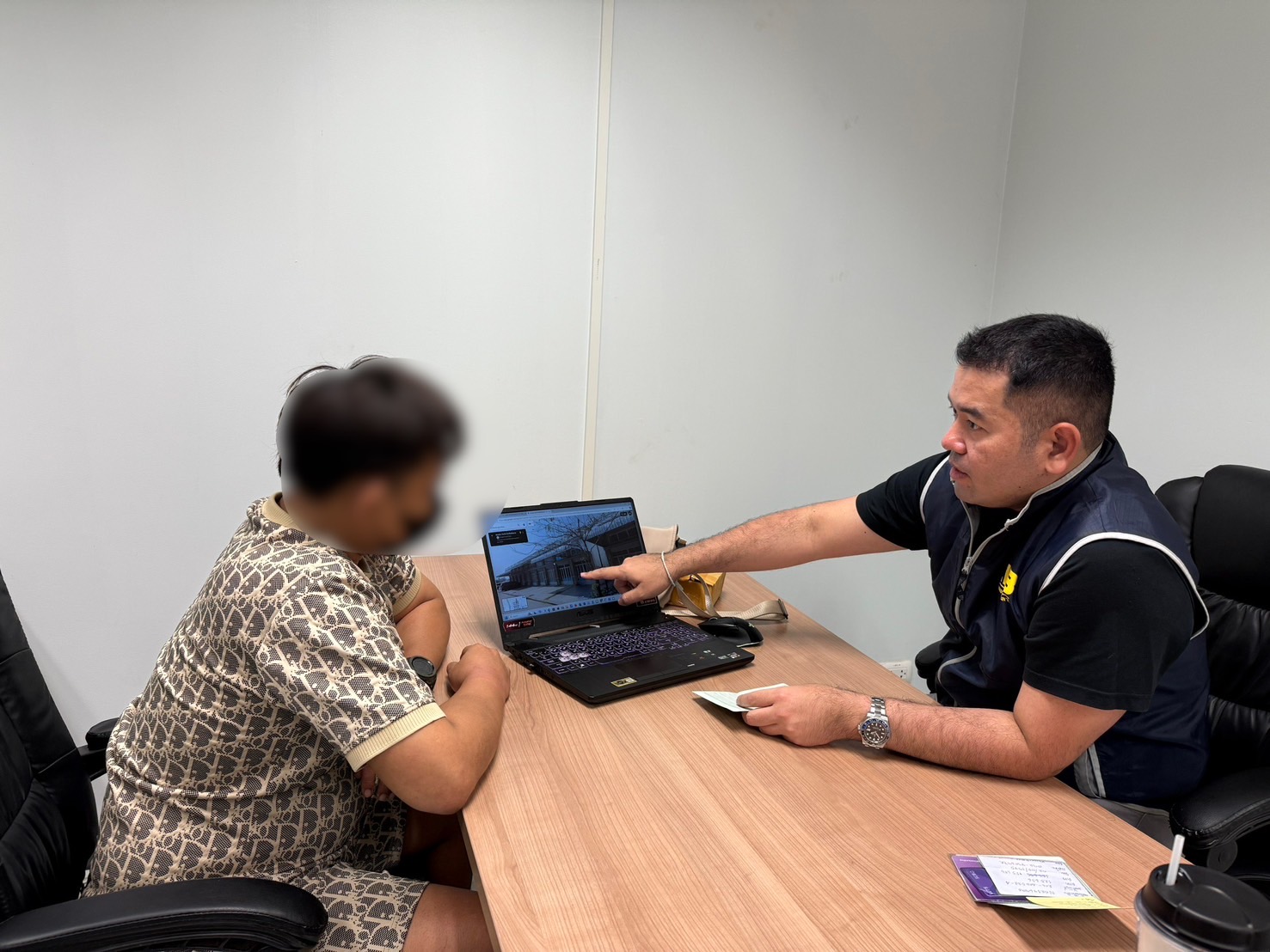 สอบถามคำให้การเบื้องต้น ผู้ต้องหาให้การภาคเสธ โดยให้การว่า ตั้งแต่ปลายปี 2566 ได้ถูกหลอกว่าให้ไปทำงานเกี่ยวกับเว็บพนัน ที่ปอยเปต ประเทศกัมพูชา แต่เมื่อไปถึง ก็ถูกยึดโทรศัพท์และให้เปิดบัญชีธนาคารออนไลน์และสแกนหน้า ที่ออฟฟิศ Call Center จากนั้นจึงได้ ผันตัวเป็นนายหน้าในการจัดหาบัญชีม้าและซิมม้า ให้กับแก๊ง Call Center ทั่วปอยเปต ประเทศกัมพูชา เป็นเวลากว่า 1 ปี โดยมีการขายซิมม้าไปแล้วกว่า 200,000 ซิม (เฉลี่ยวันละประมาณ 2,000 ซิม) และบัญชีม้ากว่า 200 บัญชี นำตัวผู้ต้องหาส่ง พนักงานสอบสวน กก.3 บก.ปอท. เพื่อดำเนินคดีตามกฎหมายต่อไป