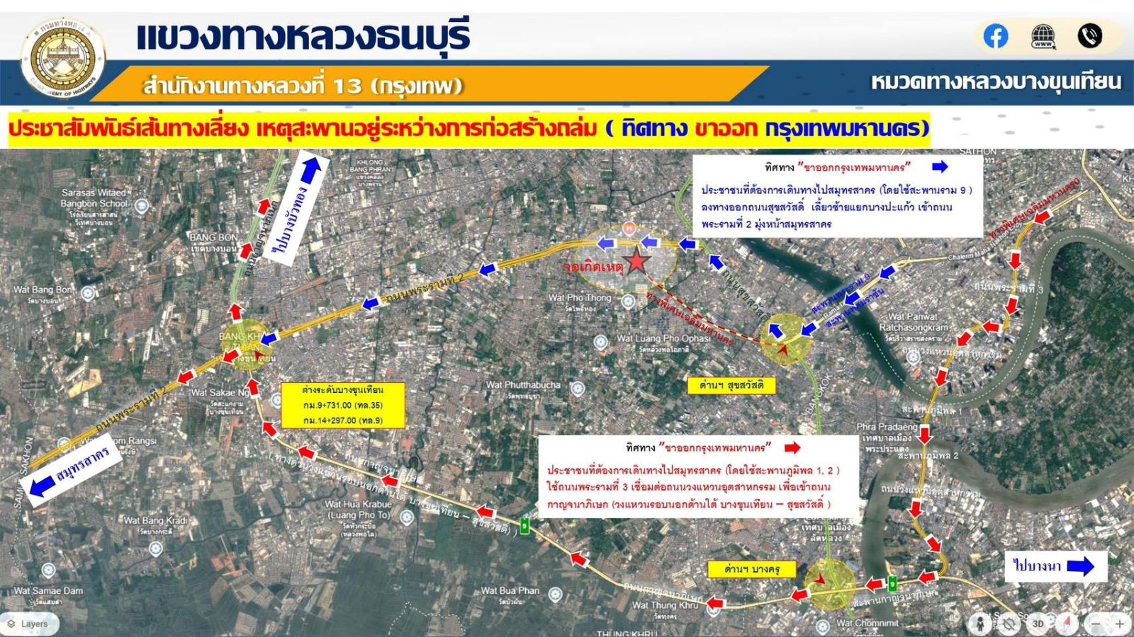 • ถนนพระราม 2 ขาเข้า แนะใช้เส้นทางถนนบางขุนเทียน - ชายทะเล จนถึงแยกบางบอน