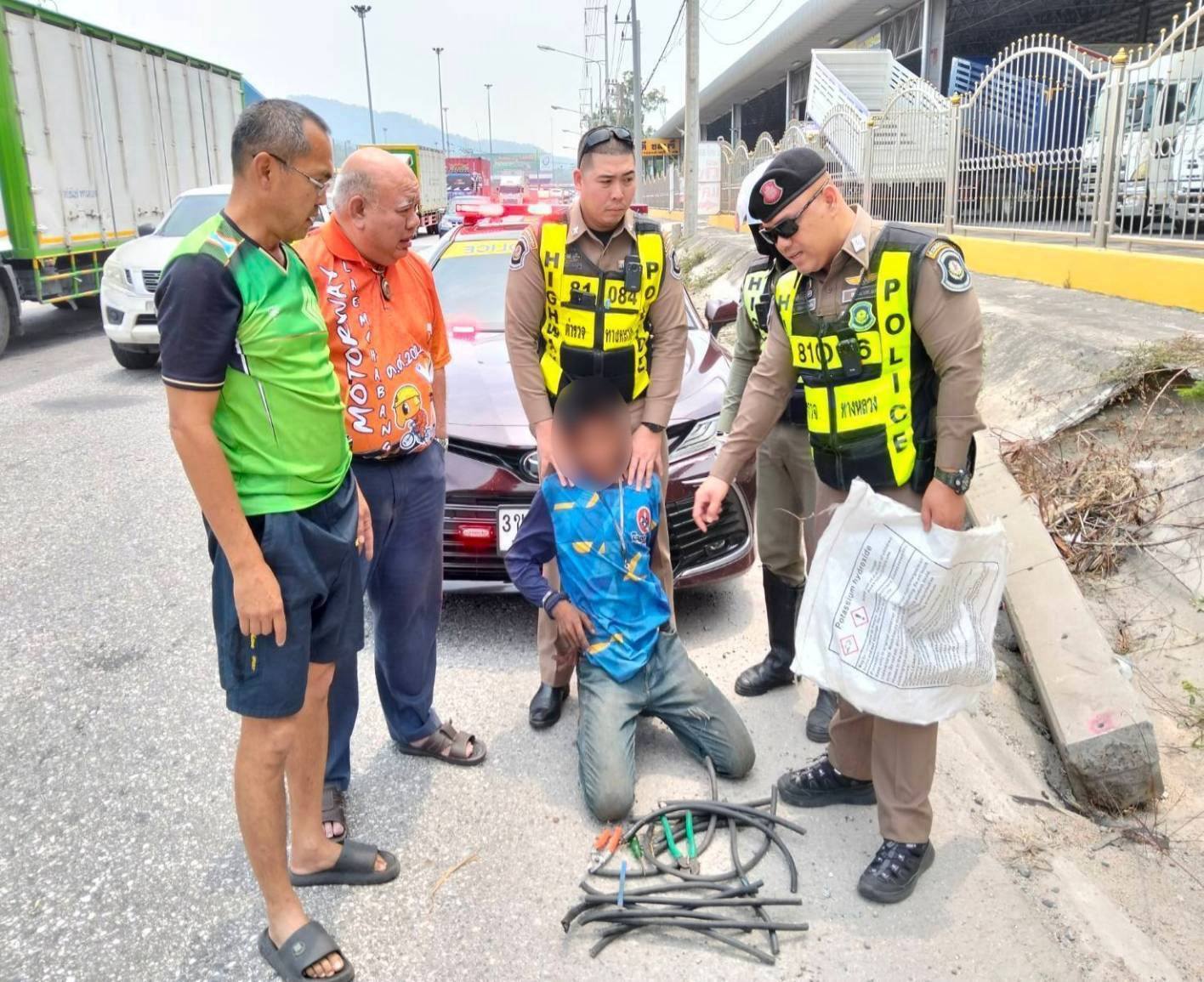 ชุดจับกุมจึงได้รีบเข้าตรวจสอบที่เกิดเหตุ ขณะถึงที่เกิดเหตุพบนายเอก(นามสมมติ) อายุ 18 ปี กำลังก่อเหตุโดยใช้มือลากและดึงสายไฟฟ้าซึ่งใช้ส่งไฟฟ้าบริเวณดังกล่าว เจ้าหน้าที่ตำรวจชุดจับกุมจึงได้แสดงตัวพร้อมทั้งได้ทำการเข้าควบคุมตัวบุคคลดังกล่าวเพื่อทำการจับกุมและตรวจค้น ขณะนั้นนายเอกฯ ได้พบเจ้าหน้าที่ตำรวจจึงได้วิ่งหลบหนีการจับกุม จนกระทั่งสามารถทำการจับกุมตัวไว้ได้บริเวณไหล่ทาง ทางหลวงพิเศษหมายเลข 7 กิโลเมตรที่ 0+500 ตำบลหนองข้างคอก อำเภอเมือง จังหวัดชลบุรี เจ้าหน้าที่ชุดจับกุมจึงได้ทำการตรวจค้น พบของกลางตามรายการดังกล่าว เจ้าหน้าที่ตำรวจชุดจับกุมจึงได้ทำการจับกุม และได้แจ้งสิทธิตามกฎหมายของผู้ต้องหาให้ทราบ