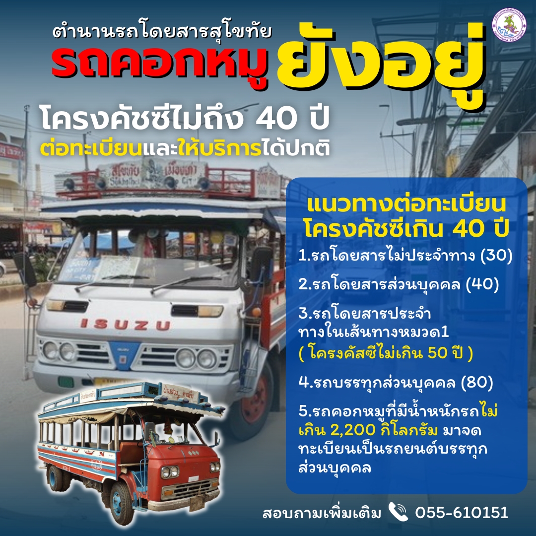 ขนส่งจังหวัดสุโขทัย ขอเรียนว่า คณะกรรมการควบคุมการขนส่งทางบกกลาง ในการประชุมครั้งที่ 3/2558 เมื่อวันที่ 11 มีนาคม 2558 ได้มีมติอนุมัติให้กำหนดอายุการใช้งานสูงสุดของรถโดยสารประจำทางหมวด 3 และหมวด 4 ส่วนภูมิภาค ระยะทางไม่เกิน 300 กิโลเมตร กำหนดอายุการใช้งานสูงสุดของโครงคัสซีต้องไม่เกิน 40 ปี โดยให้รถโดยสารประจำทางที่บรรจุในเส้นทางที่ได้รับใบอนุญาตประกอบการขนส่งไว้แล้ว ถ้าอายุโครงคัสซีเหลือไม่ถึง 10 ปี หรือมีอายุโครงคัสซีเกินกว่าที่กำหนดให้ใช้งานต่อไปอีก 10 ปี ซึ่งการกำหนดอายุการใช้งานสูงสุดของรถโดยสารประจำทางให้มีผลใช้บังคับตั้งแต่วันที่ 11 มีนาคม 2558 เป็นต้นไป ส่งผลให้ในปี 2568 รถโดยสารคอกหมูหรือรถโดยสารสองแถวในเส้นทางหมวด 3 สายที่ 668 พิษณุโลก - กงไกรลาศ และเส้นทางหมวด 4 จังหวัดสุโขทัย ซึ่งมีอายุการใช้งานของโครงคัสซีเกิน 40 ปี ไม่สามารถต่อทะเบียนรถได้ แต่อย่างไรก็ตาม เจ้าของรถสามารถนำรถมาจดทะเบียนเป็นรถโดยสารไม่ประจำทาง รถโดยสารส่วนบุคคล รถโดยสารประจำทางในเส้นทางหมวด 1 ซึ่งต้องมีอายุการใช้งานของโครงคัสซีไม่เกิน 50 ปี และรถบรรทุกส่วนบุคคลตามพระราชบัญญัติการขนส่งทางบก พ.ศ. 2522 หรือนำรถโดยสารคอกหมูที่มีน้ำหนักรถไม่เกิน 2,200 กิโลกรัม มาจดทะเบียนเป็นรถยนต์บรรทุกส่วนบุคคลตามพระราชบัญญัติรถยนต์ พ.ศ. 2522 ต่อไปได้