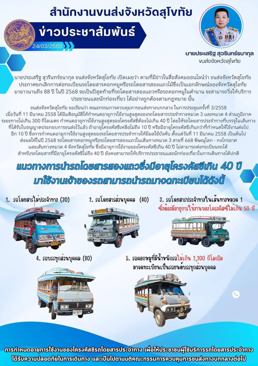 นายประเสริฐ สุวรินทร์ธนากุล ขนส่งจังหวัดสุโขทัย เปิดเผยว่า ตามที่มีข่าวในสื่อสังคมออนไลน์ว่า ขนส่งจังหวัดสุโขทัยประกาศยกเลิกการต่อทะเบียนรถโดยสารคอกหมูหรือรถโดยสารสองแถวไม้ ซึ่งเป็นเอกลักษณ์ของจังหวัดสุโขทัยมายาวนานถึง 88 ปี ในปี 2568 จะเป็นปีสุดท้ายที่รถโดยสารสองแถวหรือรถคอกหมูในตำนาน จะสามารถวิ่งให้บริการประชาชนและนักท่องเที่ยว ได้อย่างถูกต้องตามกฎหมาย นั้น