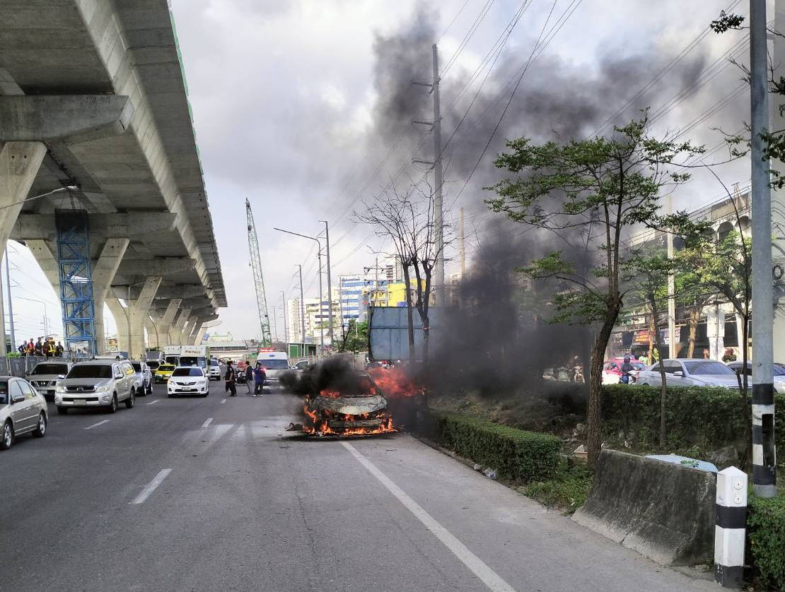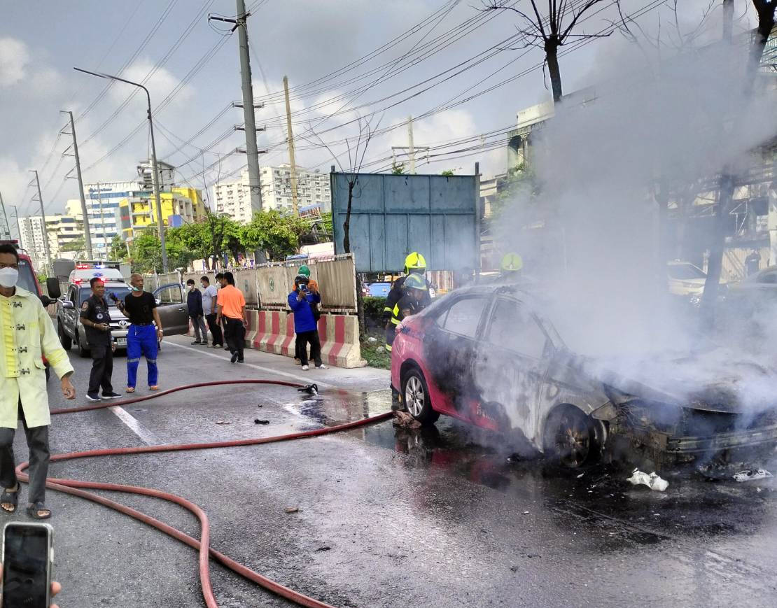 ไฟไหม้รถแท็กซี่ เสียหายทั้งคัน กลางถนนพระราม 2