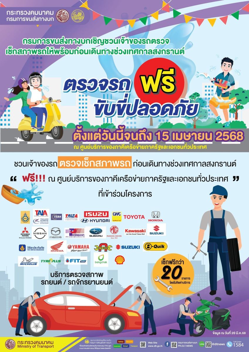 นายจิรุตม์ วิศาลจิตร อธิบดีกรมการขนส่งทางบก กล่าวว่า เทศกาลสงกรานต์เป็นช่วงวันหยุดยาวที่ประชาชนนิยมเดินทางกลับภูมิลำเนาและมีนักท่องเที่ยวเดินทางไปพักผ่อนท่องเที่ยวตามสถานที่ต่าง ๆ ส่งผลให้มีการใช้รถใช้ถนนเป็นจำนวนมาก โดยความพร้อมของตัวรถมีความสำคัญที่จะช่วยสร้างความปลอดภัยให้กับผู้ขับขี่ กรมการขนส่งทางบกได้ร่วมกับภาคีเครือข่ายทั้งภาครัฐและเอกชน จัดกิจกรรม “ตรวจรถฟรี ขับขี่ปลอดภัย” เพื่อให้บริการตรวจสภาพความพร้อมของรถยนต์และรถจักรยานยนต์เบื้องต้นก่อนเดินทาง กว่า 20 รายการ โดยไม่คิดค่าบริการ เช่น การตรวจระบบเบรก สภาพยาง การทำงานของเครื่องยนต์ ระดับน้ำมันเครื่องและความสกปรกของน้ำมันเครื่อง หม้อน้ำและรอยรั่ว ไส้กรองอากาศ การทำงานของไฟส่องสว่างและไฟสัญญาณต่าง ๆ เป็นต้น ซึ่งจะได้รับการดูแลจากช่างผู้ชำนาญ นอกจากนี้ บางหน่วยงานยังมีบริการตรวจลูกหมากปีกนก ลูกปืนล้อ ตรวจถังน้ำมันเชื้อเพลิง รวมถึงท่อและข้อต่อน้ำมันเชื้อเพลิงให้เพิ่มเติม ทั้งยังให้ส่วนลดค่าอะไหล่บางรายการอีกด้วย โดยเจ้าของรถยนต์และรถจักรยานยนต์สามารถนำรถเข้ารับบริการที่ศูนย์บริการของภาคีเครือข่ายภาครัฐและเอกชนทั่วประเทศ ที่มีป้ายประชาสัมพันธ์ “ตรวจรถฟรี ขับขี่ปลอดภัย” ได้ตั้งแต่วันนี้จนถึงวันที่ 15 เมษายน 2568