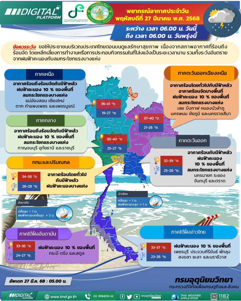 ลักษณะอากาศทั่วไป พยากรณ์อากาศ 24 ชั่วโมงข้างหน้า ประเทศไทยตอนบนมีอากาศร้อนโดยทั่วไป กับมีฟ้าหลัวและมีอากาศร้อนจัดบางพื้นที่ ทั้งนี้เนื่องจากความกดอากาศต่ำ เนื่องจากความร้อนปกคลุมประเทศไทยตอนบน ประกอบกับมีแนวลมสอบของลมตะวันตกเฉียงใต้และลมใต้พัดปกคลุมประเทศไทยตอนบน ทำให้บริเวณดังกล่าวมีฝนฟ้าคะนองกับมีลมกระโชกแรงบางแห่ง ขอให้ประชาชนบริเวณประเทศไทยตอนบนดูแลรักษาสุขภาพ เนื่องจากสภาพอากาศที่ร้อนถึงร้อนจัด โดยหลีกเลี่ยงการทำงานหรือการประกอบกิจกรรมในที่โล่งแจ้งเป็นระยะเวลานาน รวมทั้งระวังอันตรายจากฝนฟ้าคะนองกับลมกระโชกแรงบางแห่ง