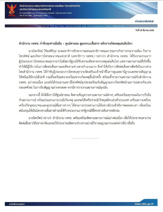 28 มีนาคม 2568 นายไตรรัตน์ วิริยะศิริกุล รองเลขาธิการรักษาการแทนเลขาธิการคณะกรรมการกิจการกระจายเสียง กิจการโทรทัศน์ และกิจการโทรคมนาคมแห่งชาติ (เลขาธิการ กสทช.) กล่าวว่า สำนักงาน กสทช. ได้รับรายงานจากผู้ประกอบการโทรคมนาคมทุกรายว่าไม่มีสถานีฐานได้รับความเสียหายจากเหตุแผ่นดินไหว แต่จากสถานการณ์ที่เกิดขึ้น ทำให้มีผู้ใช้งานในการติดต่อสื่อสารและติดตามข่าวสารจำนวนมาก จึงทำให้เกิดการติดต่อสื่อสารติดขัดในบางช่วง