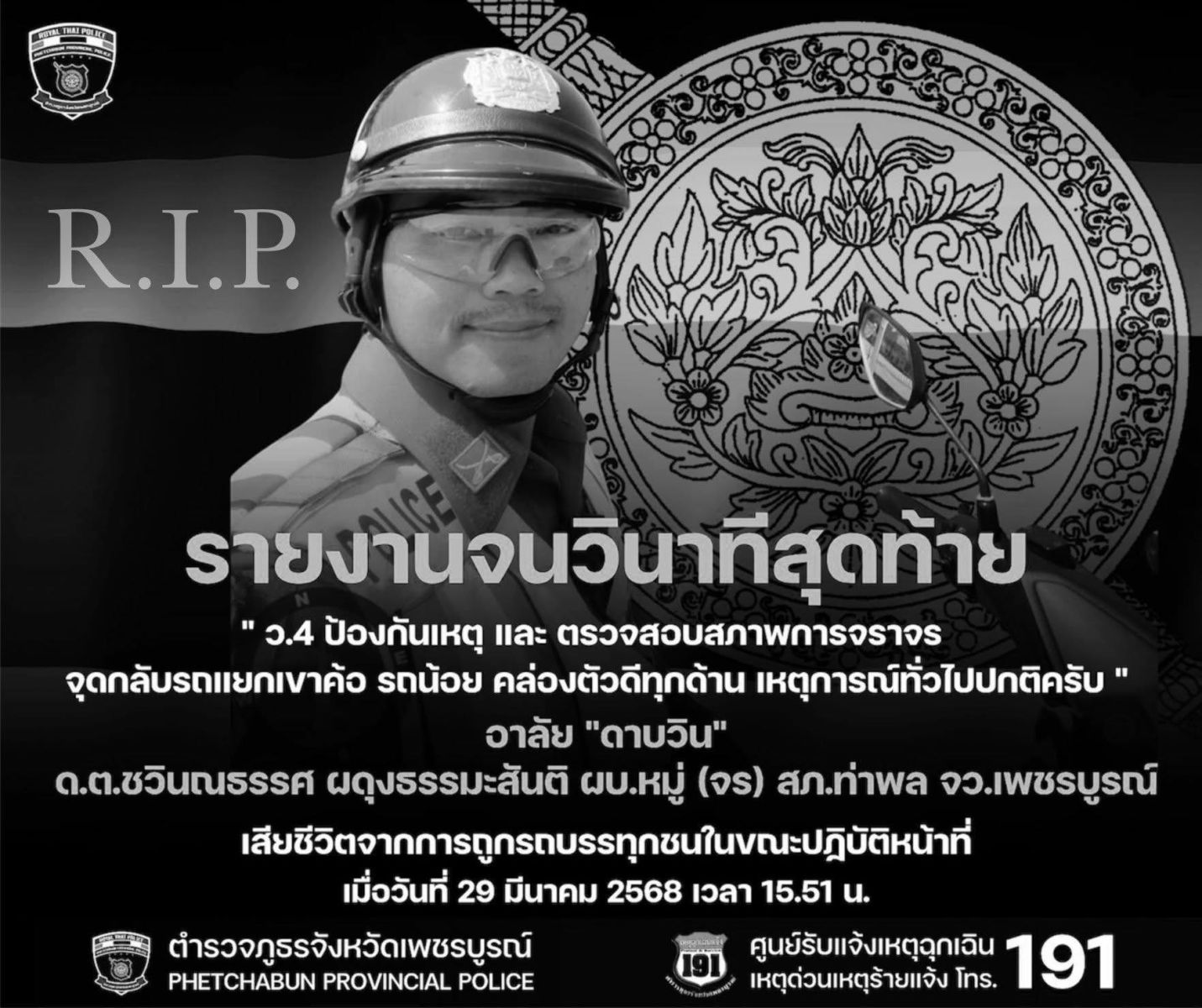 เมื่อวันที่ 29 มี.ค.2568 เจ้าหน้าที่สภ.ท่าพล อ.เมือง จ.เพชรบูรณ์ รับแจ้งอุบัติเหตุรถพ่วง 18 ล้อ ชนรถจยย. ซึ่งมีตำรวจเป็นคนขับ เสียชีวิต ทราบชื่อ ด.ต.ชวินณธรรศ ผดุงธรรมะสันติ อายุ 41 ปี สายตรวจจราจรสถานีตำรวจภูธรท่าพล เจ้าของรหัส ท่าพล6112 ซึ่งเคยได้รับการคัดเลือกให้เป็นเจ้าหน้าที่ดีเด่น ของสำนักงานตำรวจแห่งชาติ
